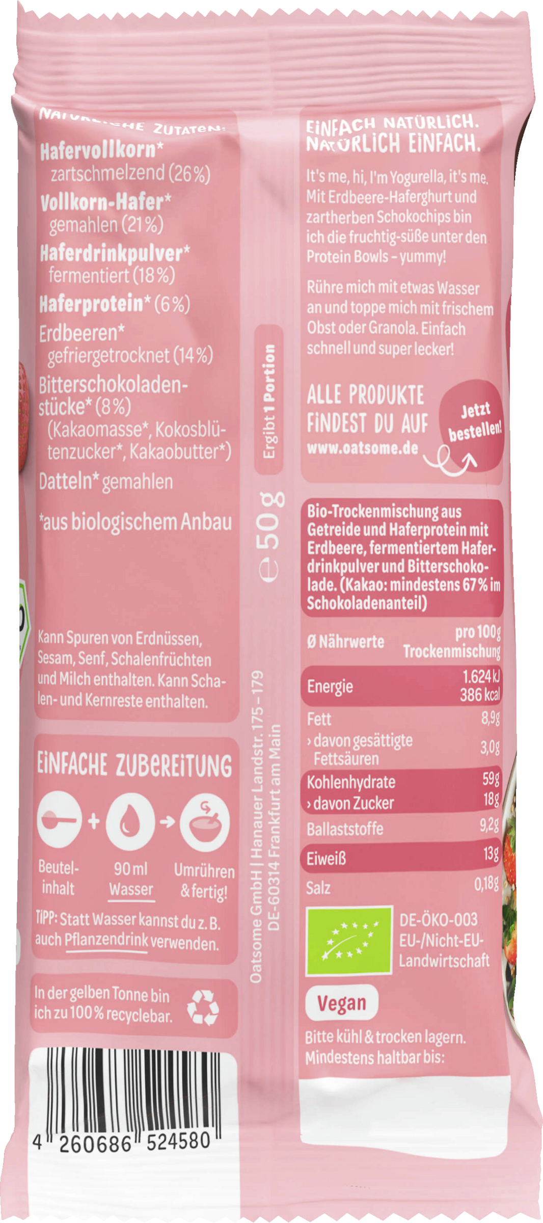 Bio Trockenmischung aus Hafervollkorn (47%) mit Erdbeere, Haferprotein, Bitterschokolade (Kakao: 67% mindestens im Schokoladenanteil) und fermentiertem Haferdrinkpulver