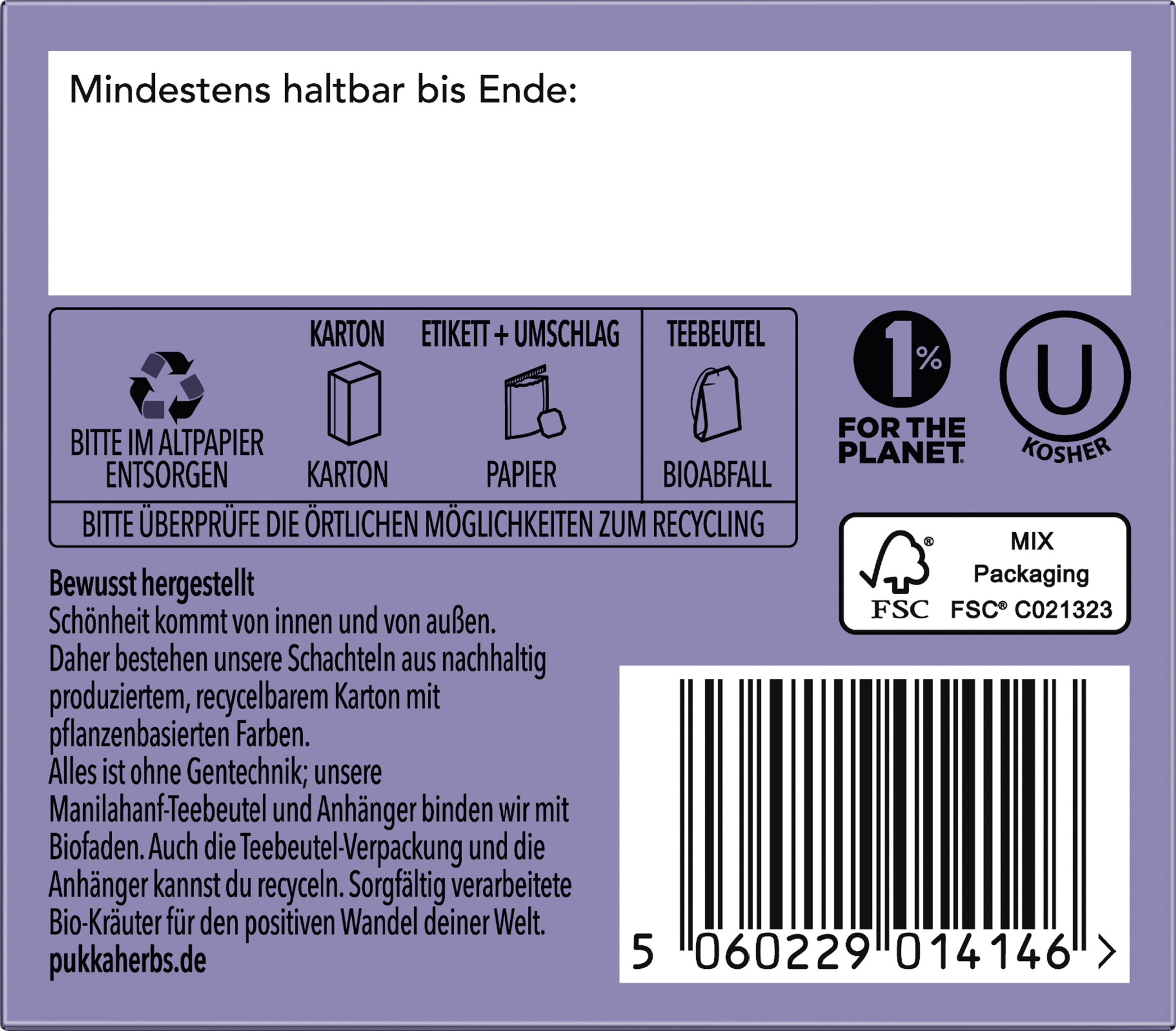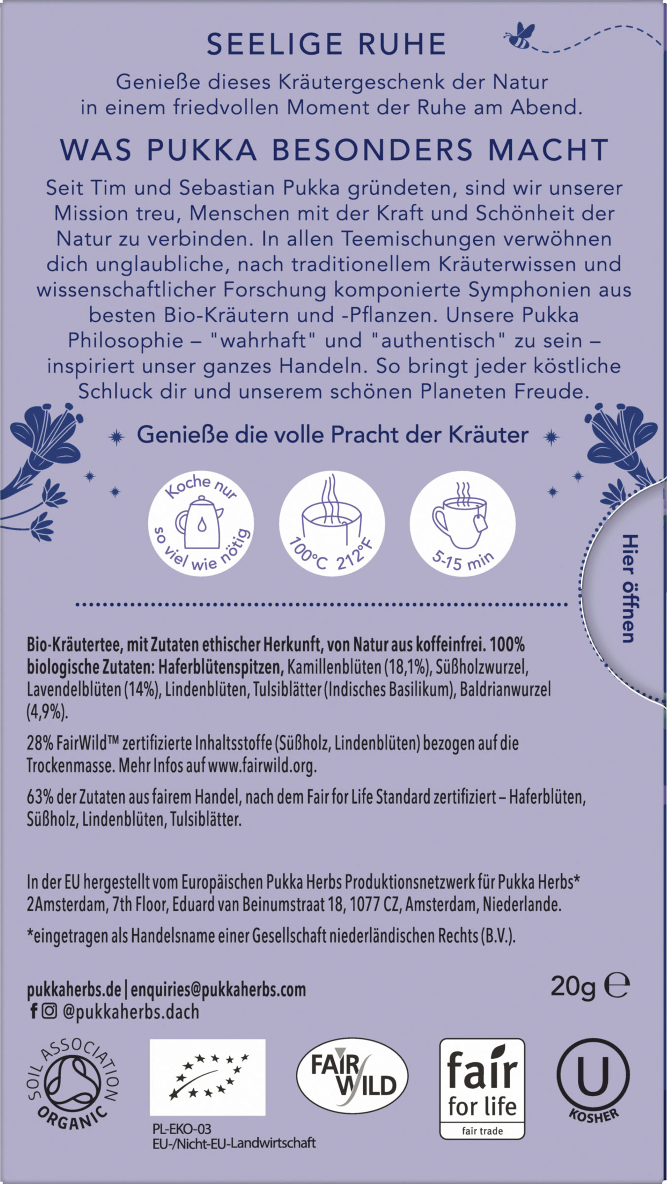 - Pukkas Bio-Kräutertee enthält ausschließlich Zutaten, die 100% biologisch sind und aus ethischem Handel kommen