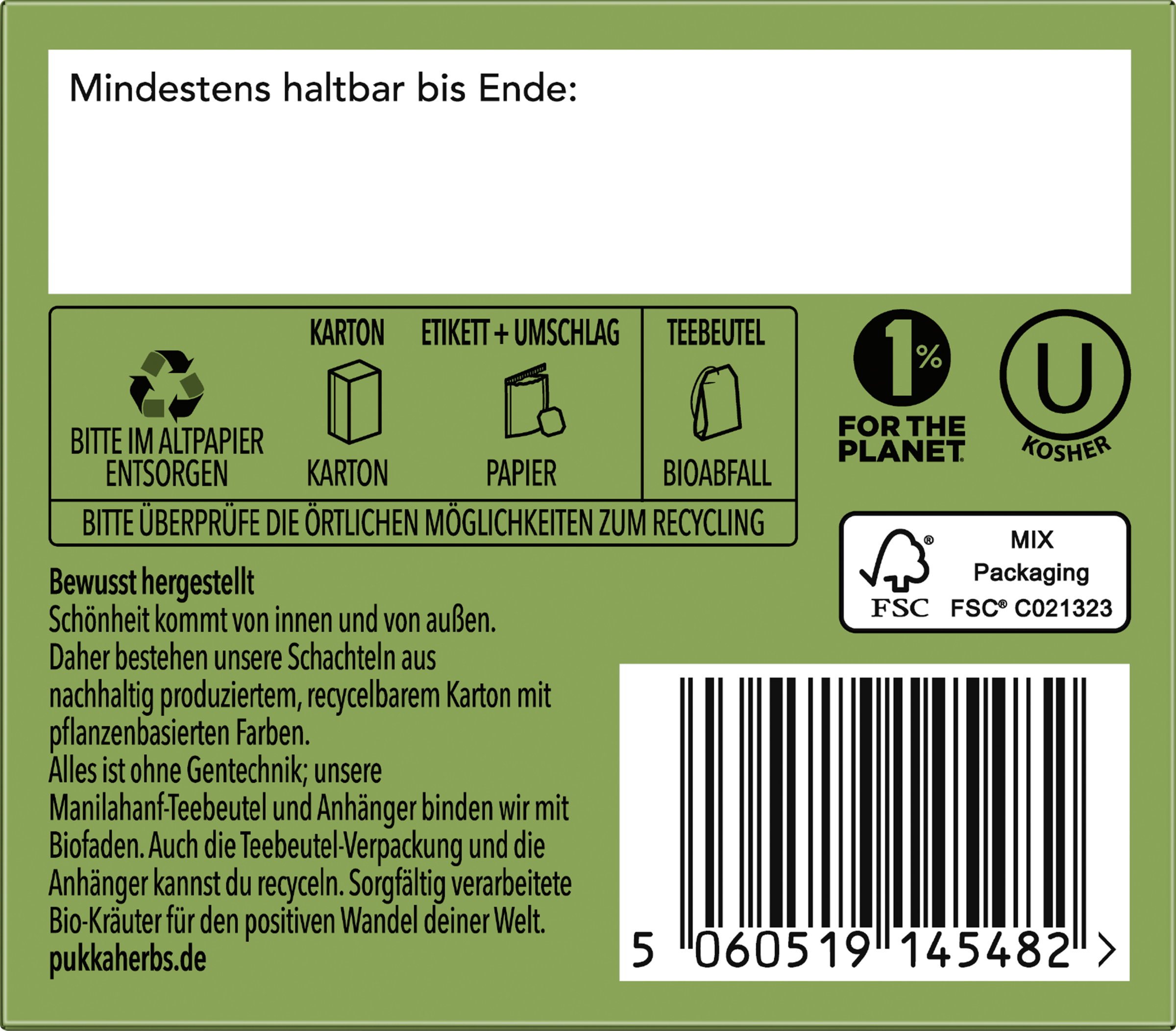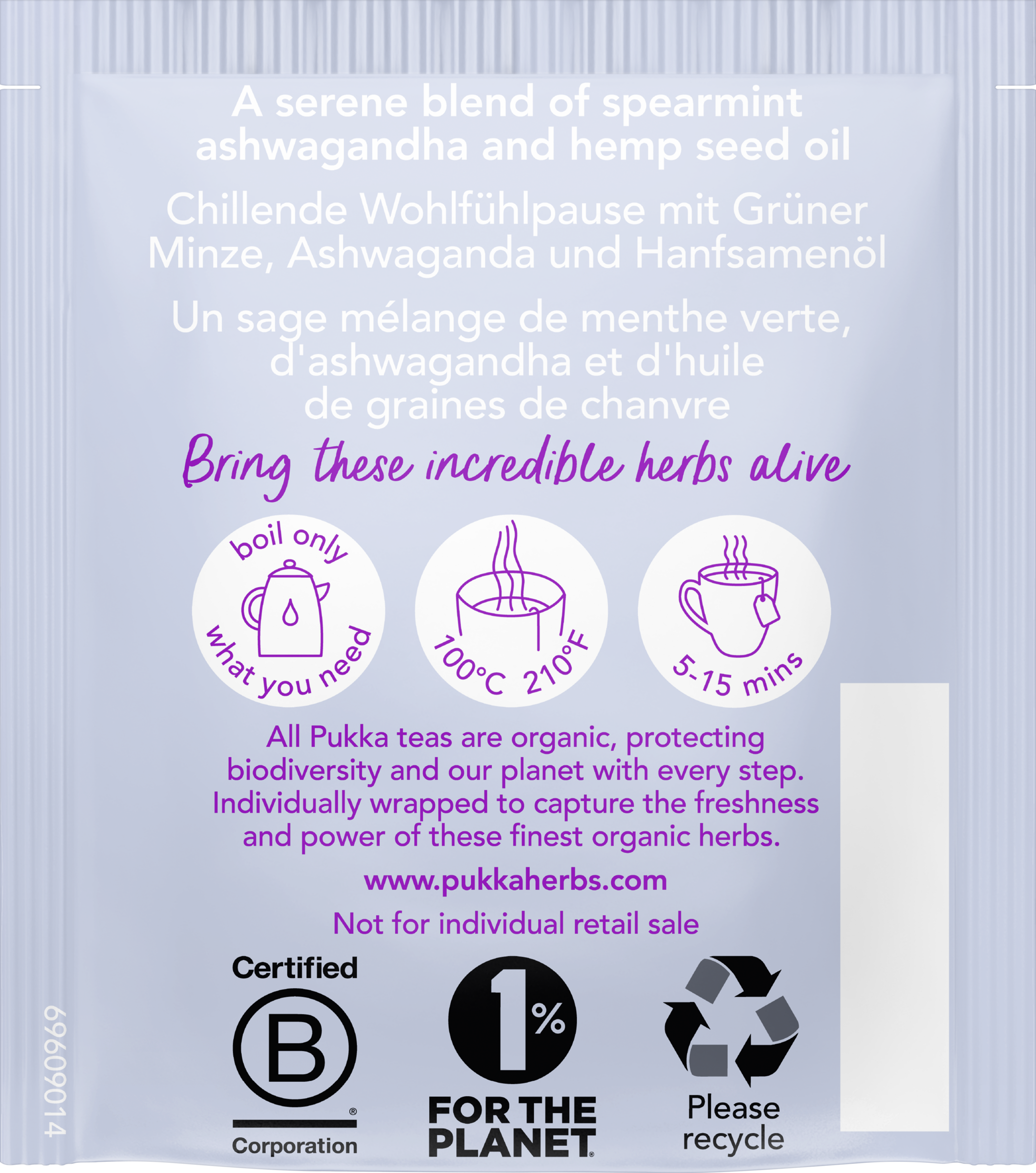 Jeder Pukka Bio-Teebeutel ist komplett plastikfrei und wird in einer eigenen recycelbaren Hülle geliefert, um die ätherische Öle unserer Bio-Kräuter zu erhalten. Jeder Teebeutel hat zwei Kammern, in denen sich diese unglaublichen Kräuter befinden und in denen die Kräuterpower in deine Tasse entweichen kann. Damit sich die Aromen vollständig entfalten können, gieße kochendes Wasser direkt auf den Beutel. Jede Pflanze liebt das Wasser, also lasse deinen Tee für den perfekten Genussmoment ausreichend ziehen. Und denke daran, nur die Wassermenge zu kochen, die du benötigst, um deinen Tee so umweltfreundlich wie möglich zu machen.