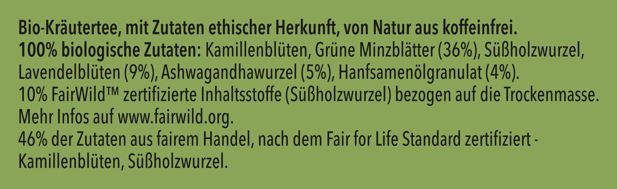 Kamillenblüten, Grüne Minzblätter (36%), Süßholzwurzel, Lavendelblüten, Ashwagandhawurzel (5%), Hanfsamenölgranulat (4%).