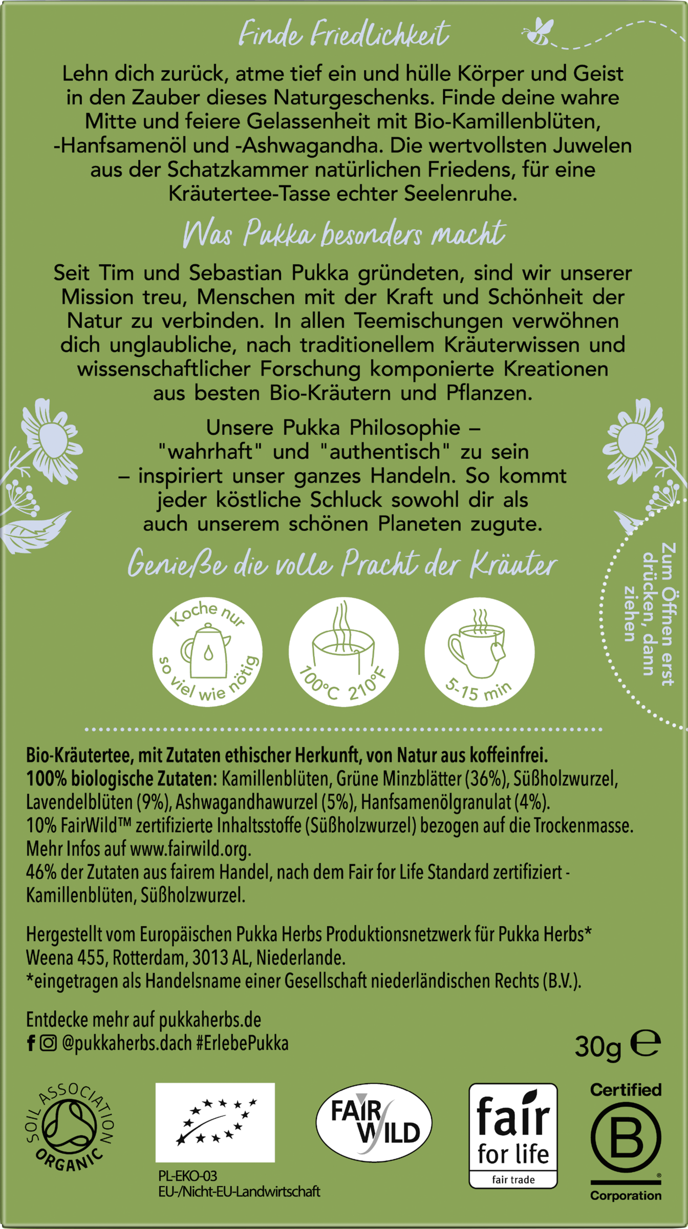 Lehn dich zurück, atme tief ein und hülle Körper und Geist in den Zauber dieses Naturgeschenks. Finde deine wahre Mitte und feiere Gelassenheit mit Bio-Kamillenblüten, -Hanf und -Ashwagandha. Die wertvollsten Juwelen aus der Schatzkammer natürlichen Friedens, für eine Kräutertee-Tasse echter Seelenruhe.