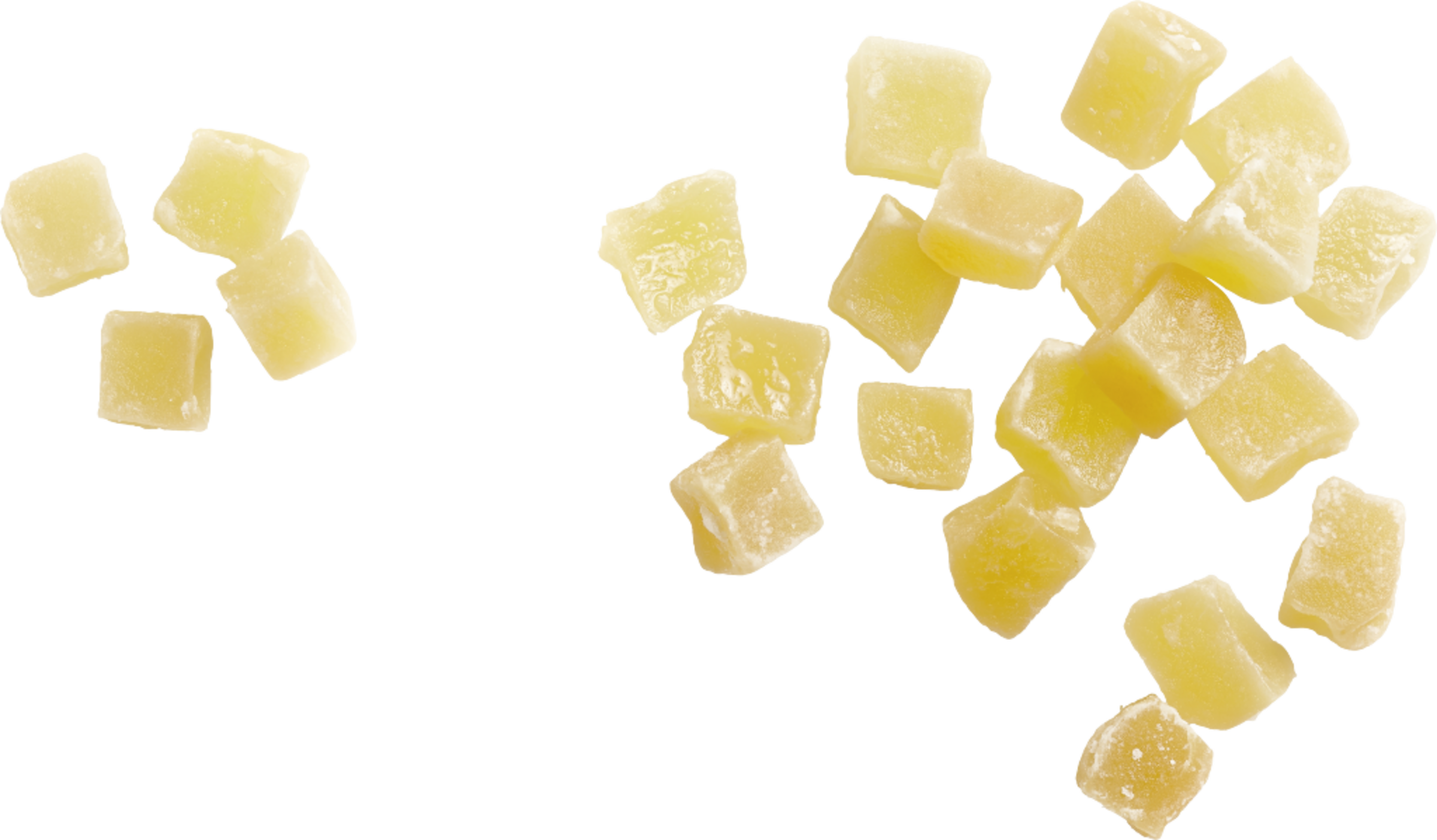 Ingwer (55 %), Zucker, Dextrose, Antioxidationsmittel: NATRIUMMETABISULFIT.