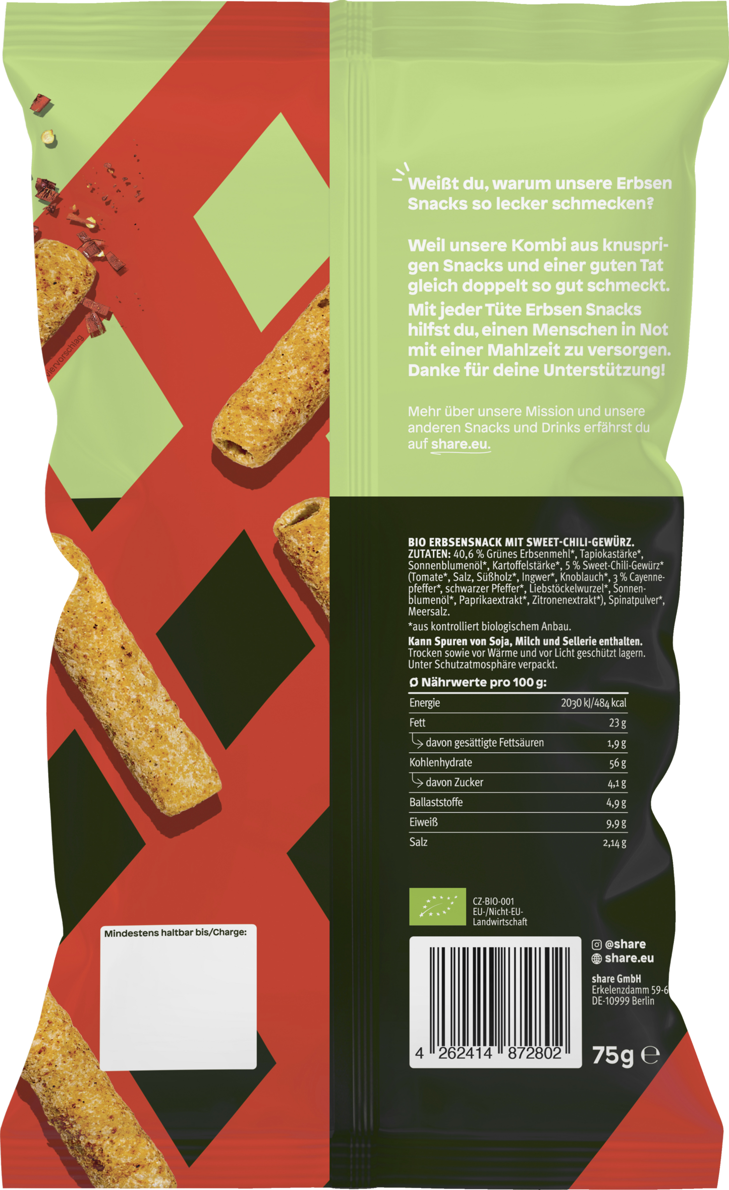 Spice up your snack life – vegan, glutenfrei und voller Pflanzenpower. Unsere Erbsen-Snacks bieten nicht nur einen einzigartigen Geschmack, sondern sind auch eine Ballaststoffquelle für deinen Snack-Alltag. Voller Erbsenmehl und in bester Bio-Qualität, sind sie der ideale Begleiter für jeden Moment. Mit einem Hauch von Sweet Chili bringst du ein bisschen Würze in deinen Snackmoment – ganz ohne Kompromisse. Erbsen Snacks für den guten Zweck: Jeder Erbsen Snack spendet eine Mahlzeit an einen Menschen in Not.