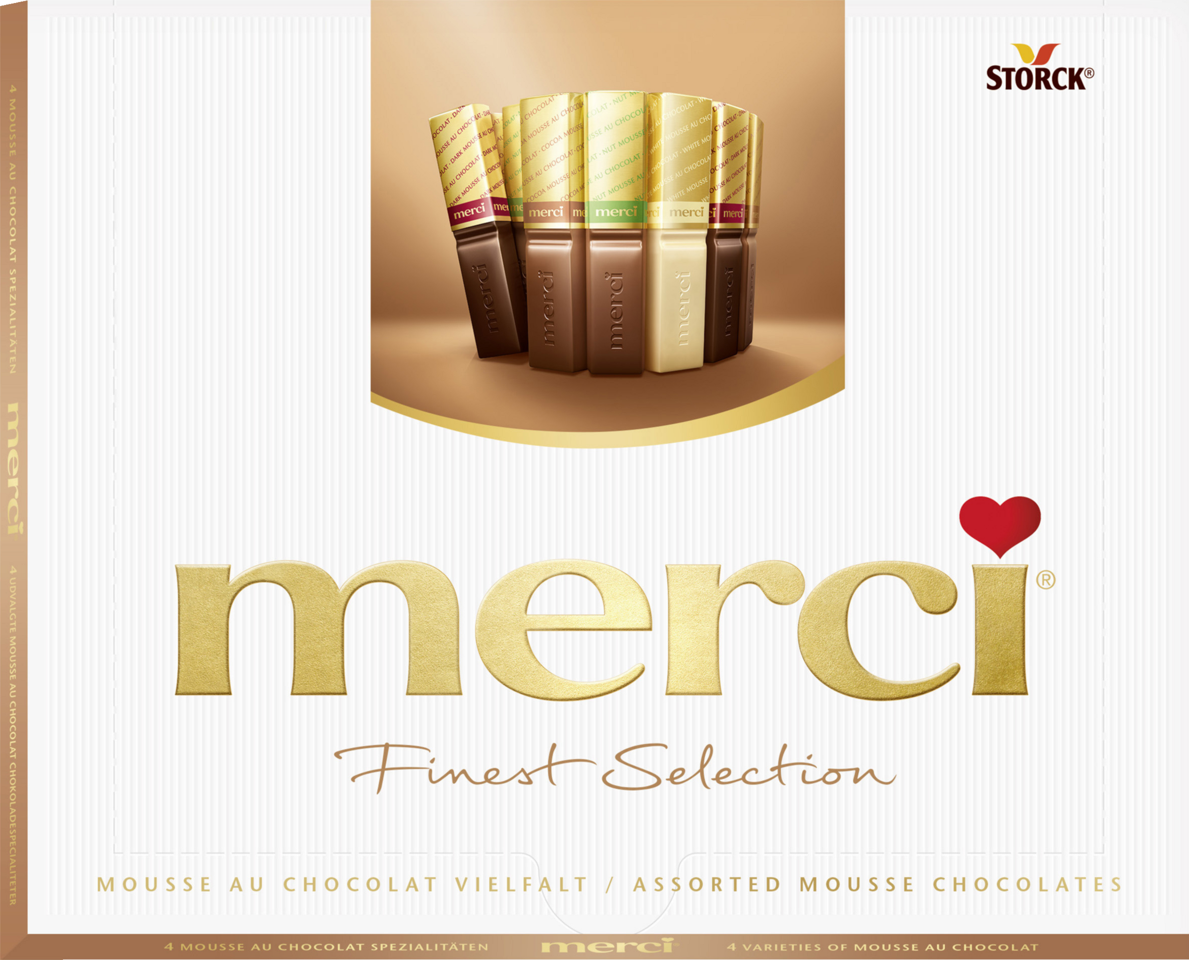 Ein Genuss wie auf Wolken. Mit merci Finest Selection Mousse au Chocolat erleben Sie die beliebte Schokolade in einem ganz besonderen neuen Gewand. Entdecken Sie vier leckeren Sorten, die unter ihrer feinen Schokoladenhülle mit einer zartschmelzenden Mousse gefüllt sind. Eine süße Spezialität, die sich wunderbar vernaschen und verschenken lässt.