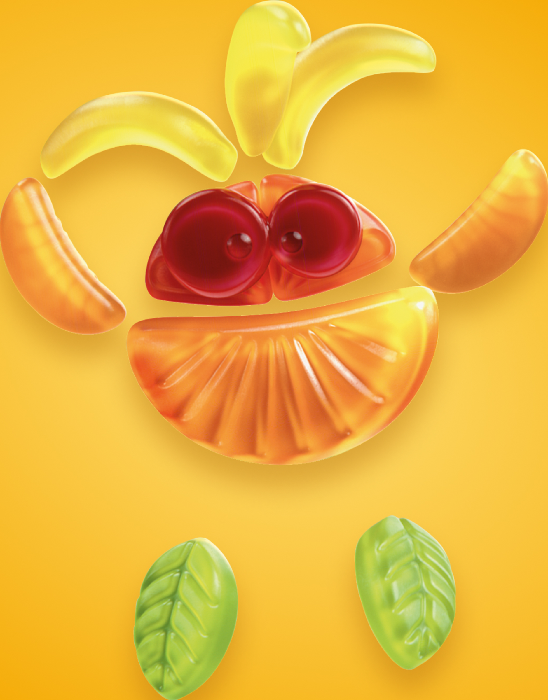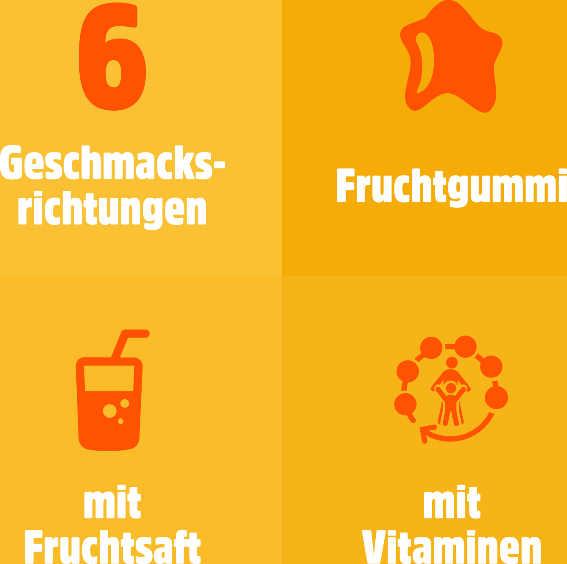 - Fruchtgummi mit 6 Geschmacks-Richtungen: Banane, Himbeere, Blutorange, Orange, Zitrone und Apfel-Birne