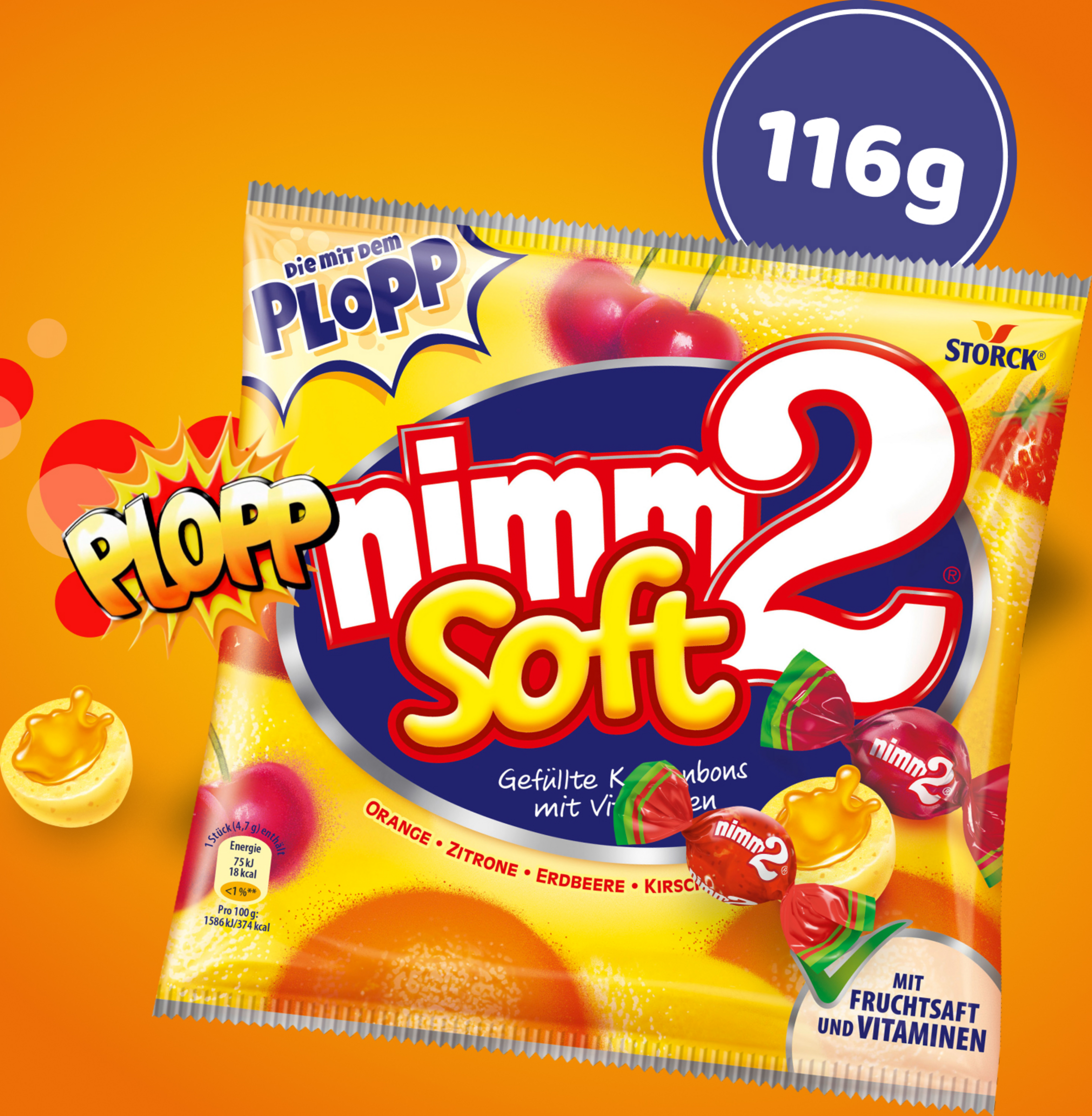 nimm2 soft - die mit dem Plopp. Die Kaubonbons mit dem Plopp sind einfach der Knaller! nimm2 soft sind super leckere Kaubonbons mit Fruchtsaft und Vitaminen. Gefüllte Kaubonbons mit Vitaminen - das sind die Fruchtkaubonbons mit dem guten von nimm2. Dabei sind sie lustig rund und köstlich gefüllt, mit Fruchtsaft und Vitaminen! Mit den 4 Sorten Orange, Zitrone, Erdbeere und Kirsche bietet nimm2 soft ein einzigartiges und vor allem super spaßiges Kauerlebnis.