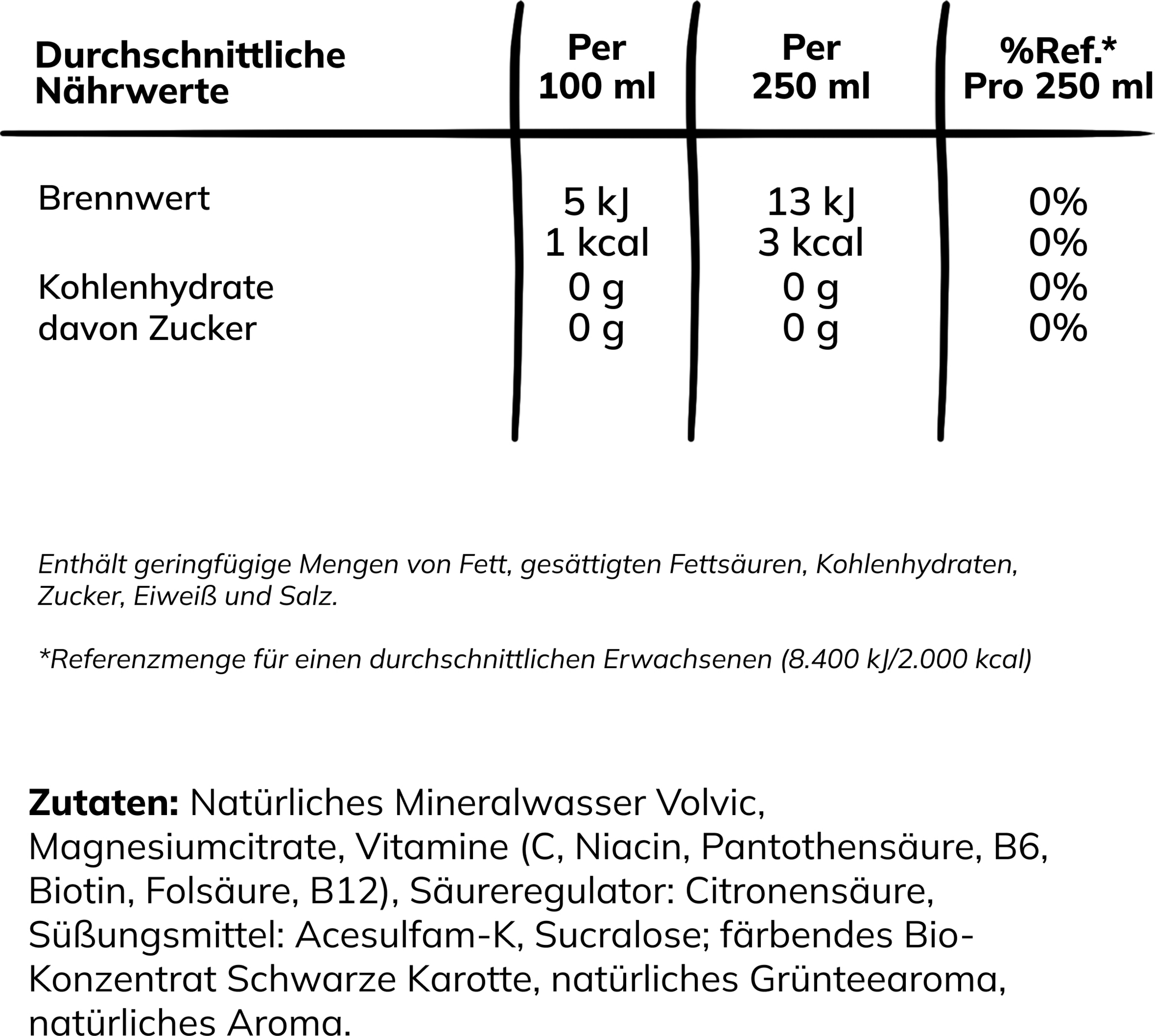 Natürliches Mineralwasser Volvic, Magnesiumcitrate, Vitamine (C, Niacin, Pantothensäure, B6, Biotin, Folsäure, B12), Säureregulator: Citronensäure, Süßungsmittel: Acesulfam-K, Sucralose; färbendes Bio-Konzentrat Schwarze Karotte, natürliches Grünteearoma, natürliches Aroma.