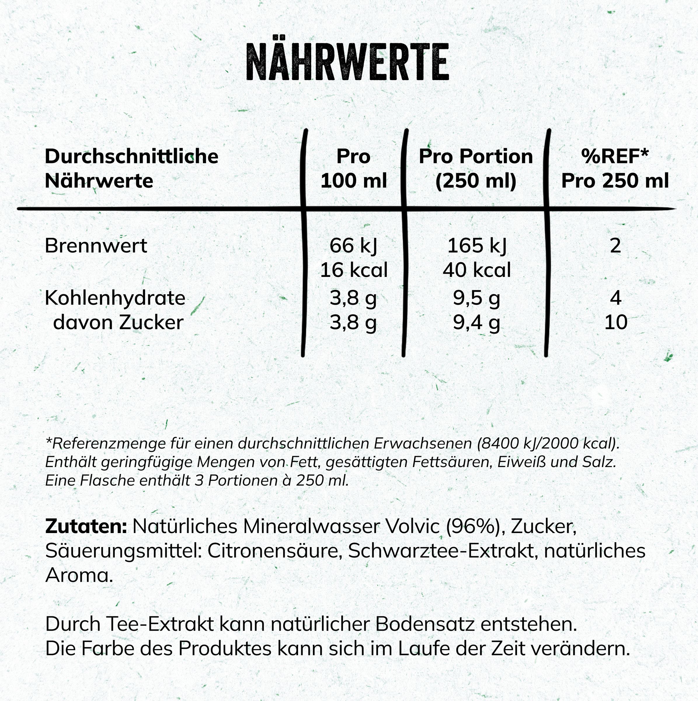 Zutaten: Natürliches Mineralwasser Volvic (96%), Zucker, Säuerungsmittel: Citronensäure, natürliches Aroma, Tee-Extrakt