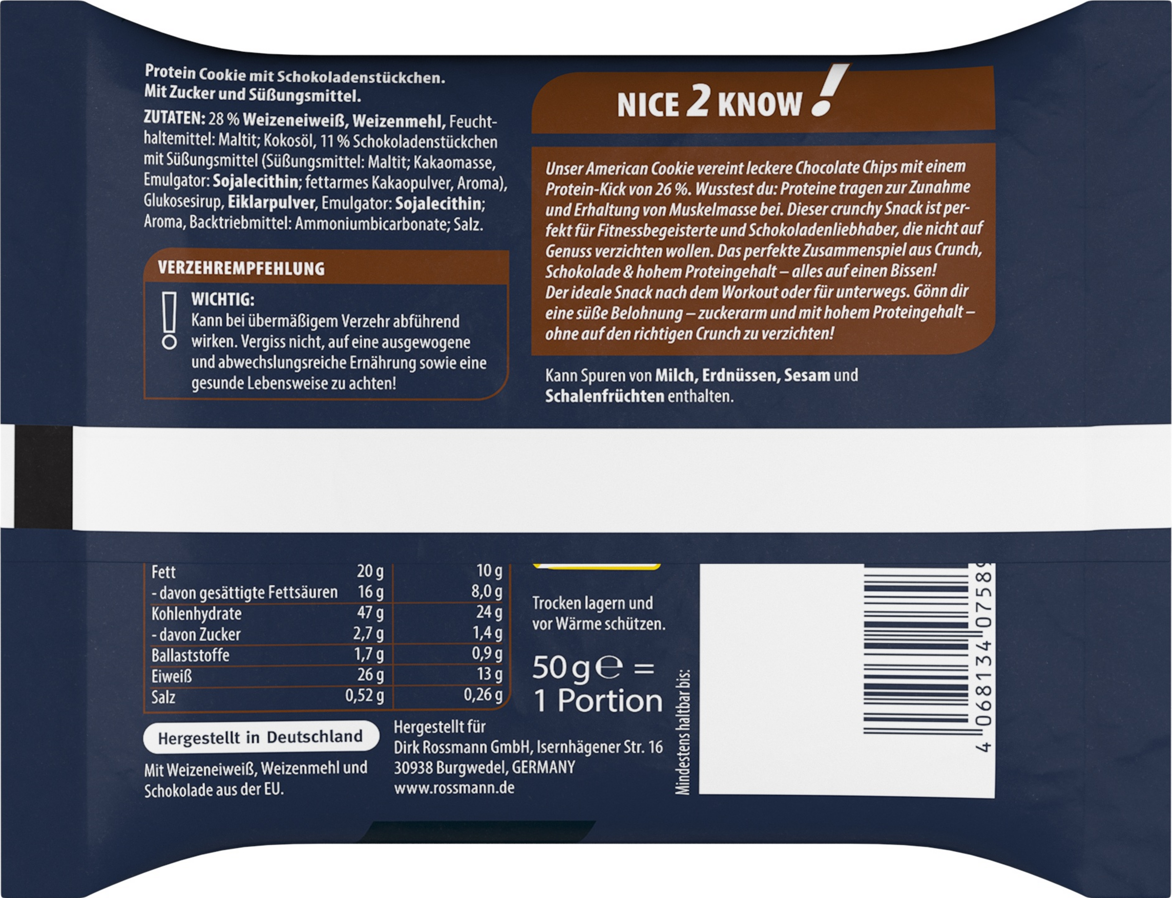 28% WEIZENEIWEIß, WEIZENMEHL, Feuchthaltemittel: Maltit; Kokosöl, 11% Schokoladenstückchen mit Süßungsmittel (Süßungsmittel: Maltit; Kakaomasse, Emulgator: SOJALECITHIN; fettarmes Kakaopulver, Aroma), Glukosesirup, EIKLARPULVER, Emulgator: SOJALECITHIN; Aroma, Backtriebmittel: Ammoniumbicarbonate; Salz. Kann Spuren von MILCH, ERDNÜSSEN, SESAM und SCHALENFRÜCHTEN enthalten.