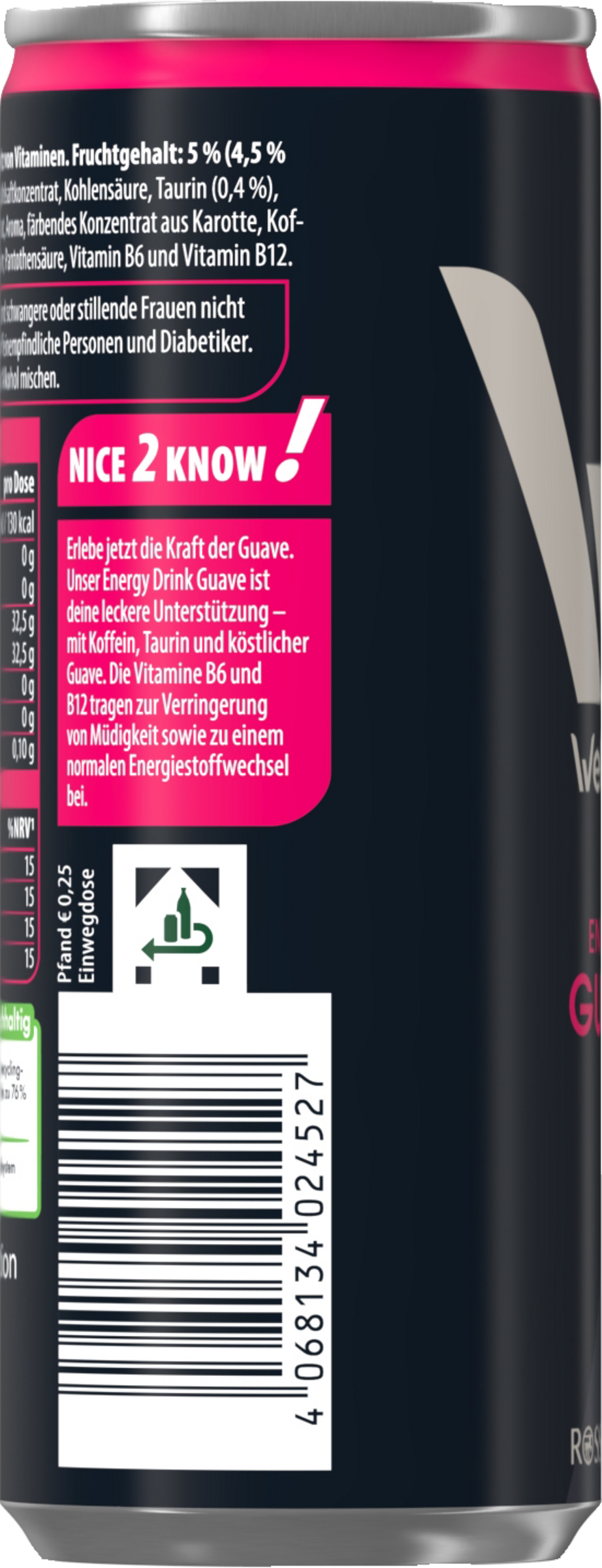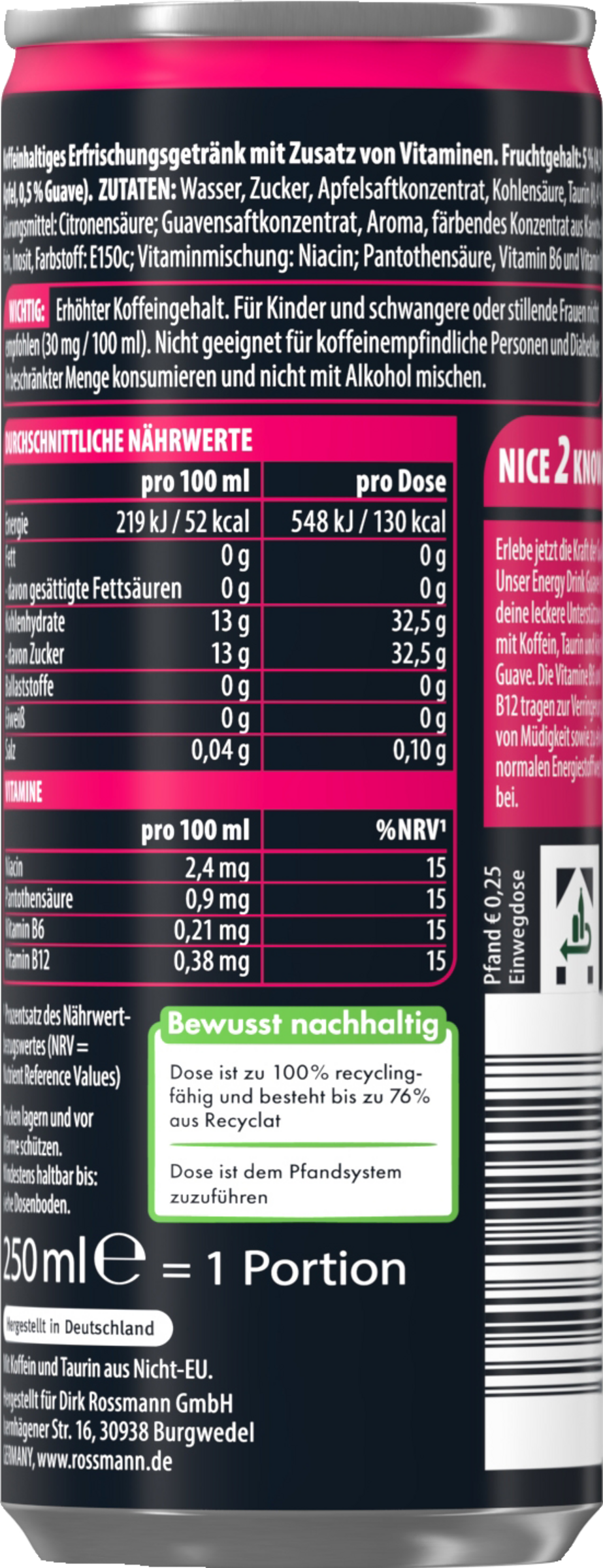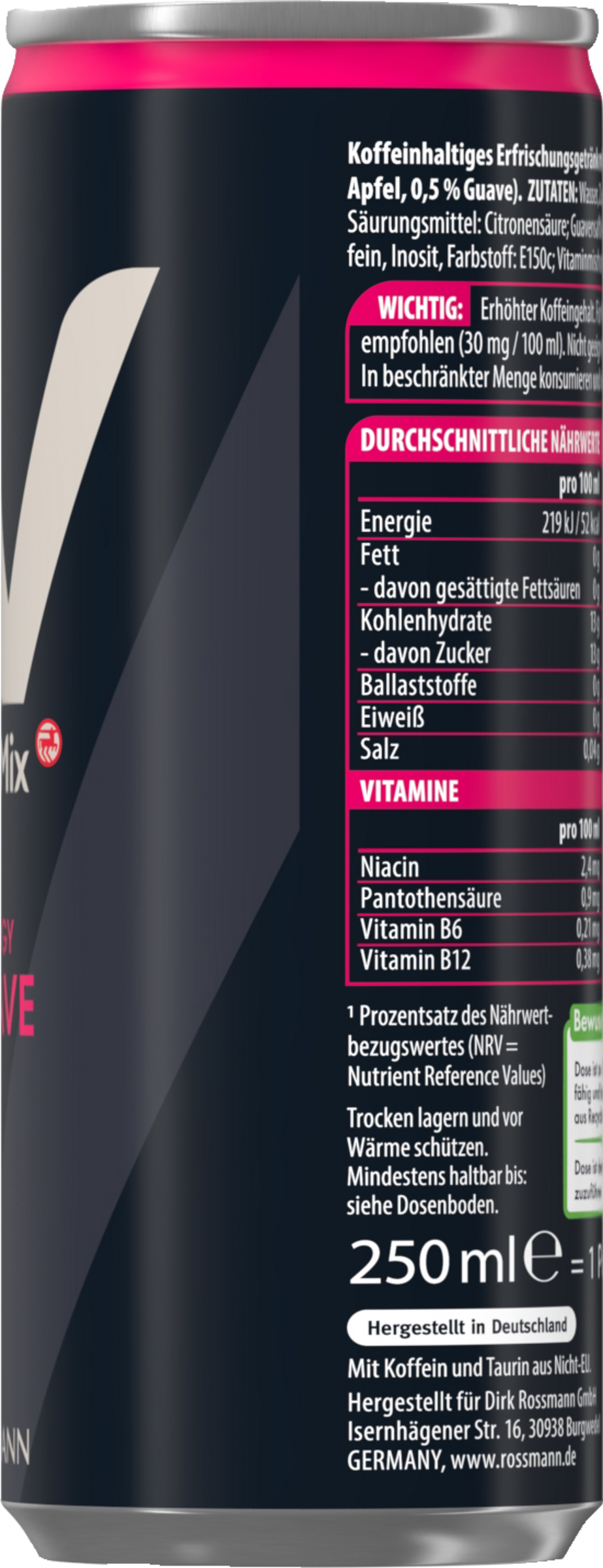 Wasser, Zucker, Apfelsaftkonzentrat, Kohlensäure, Taurin, Säuerungsmittel Citronensäure, Guavensaftkonzentrat, Aroma, färbendes Konzentrat aus Karotte, Koffein, Inosit, Farbstoff E150c, Vitaminmischung: Niacin, Pantothensäure, Vitamin B6 und Vitamin B12