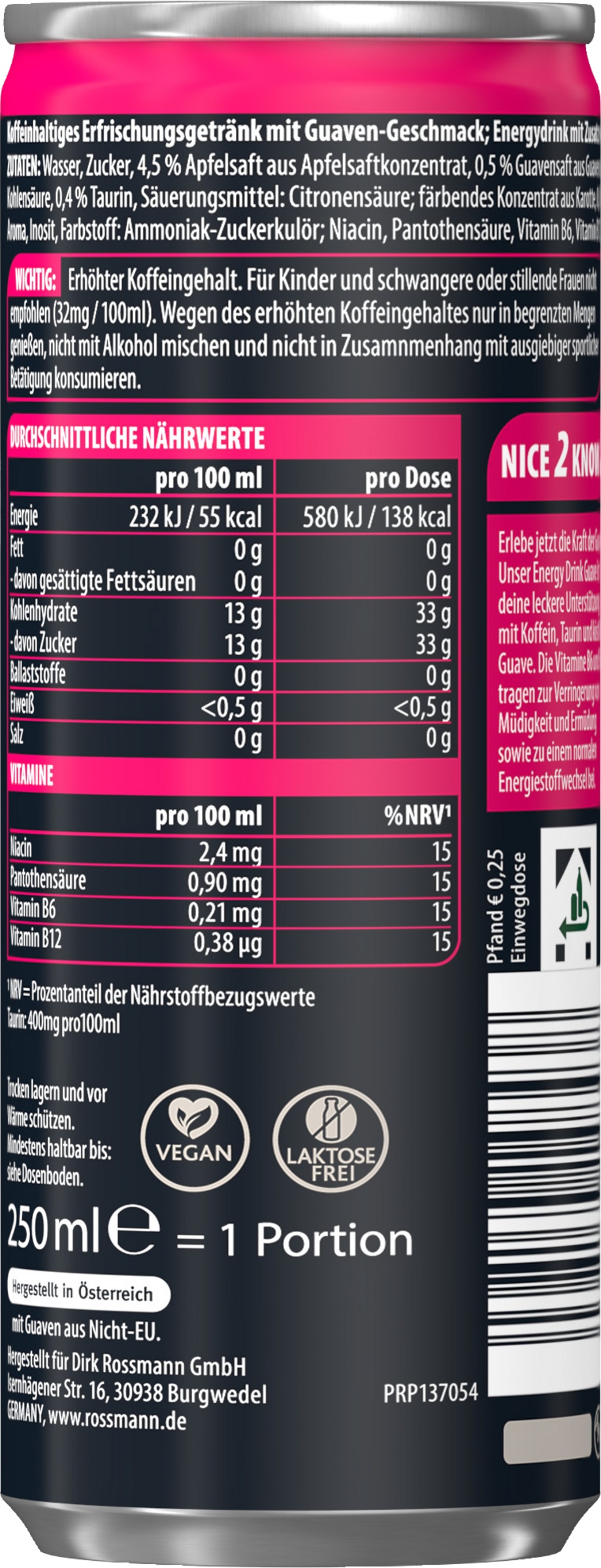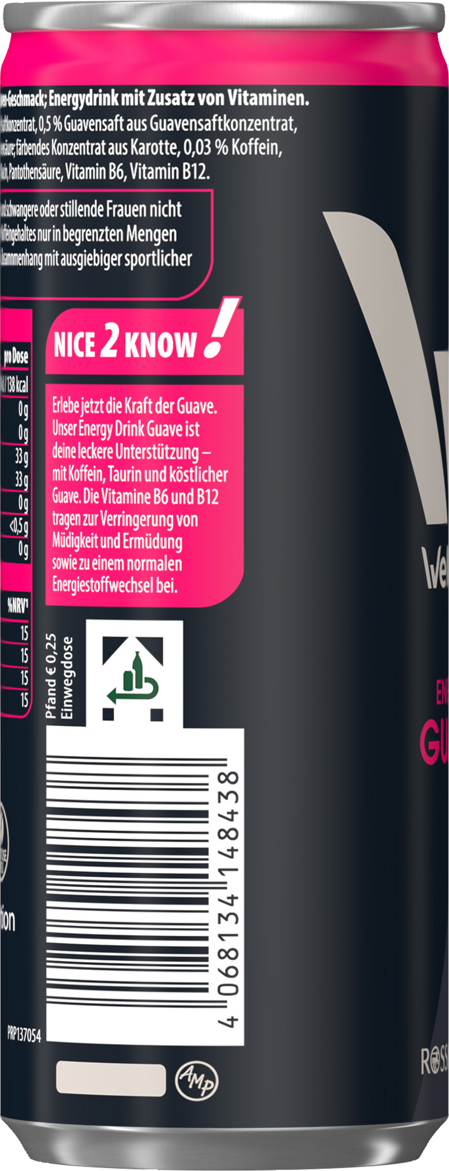Erlebe jetzt die Kraft der Guave. Unser Energy Drink Guave ist deine leckere Unterstützung - mit Koffein, Taurin und köstlicher Guave. Die Vitamine B6 und B12 tragen zur Verringerung von Müdigkeit und Ermüdung sowie zu einem normalen Energiestoffwechsel bei.