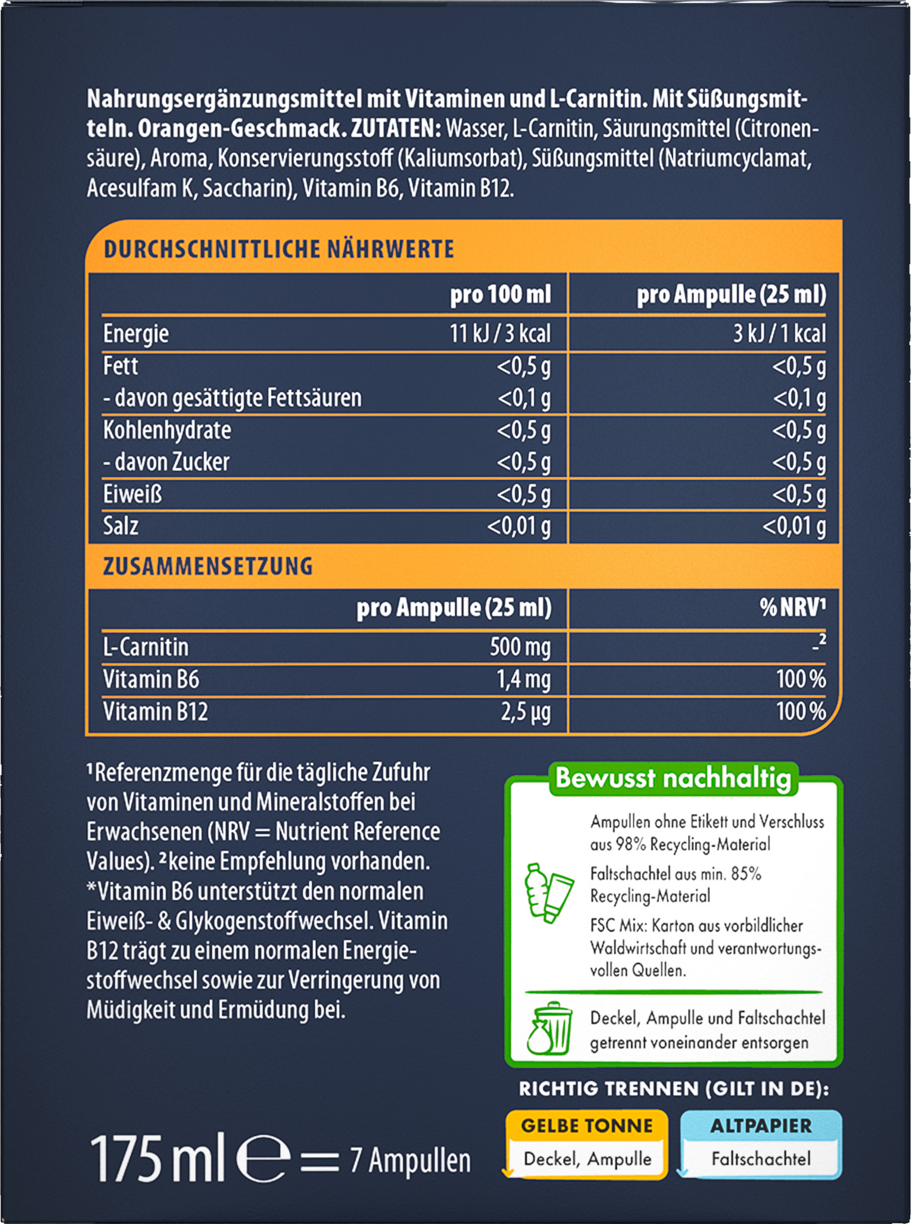 Nahrungsergänzungsmittel mit Vitaminen und L-Carnitin. Mit Süßungsmitteln. Orangen-Geschmack.