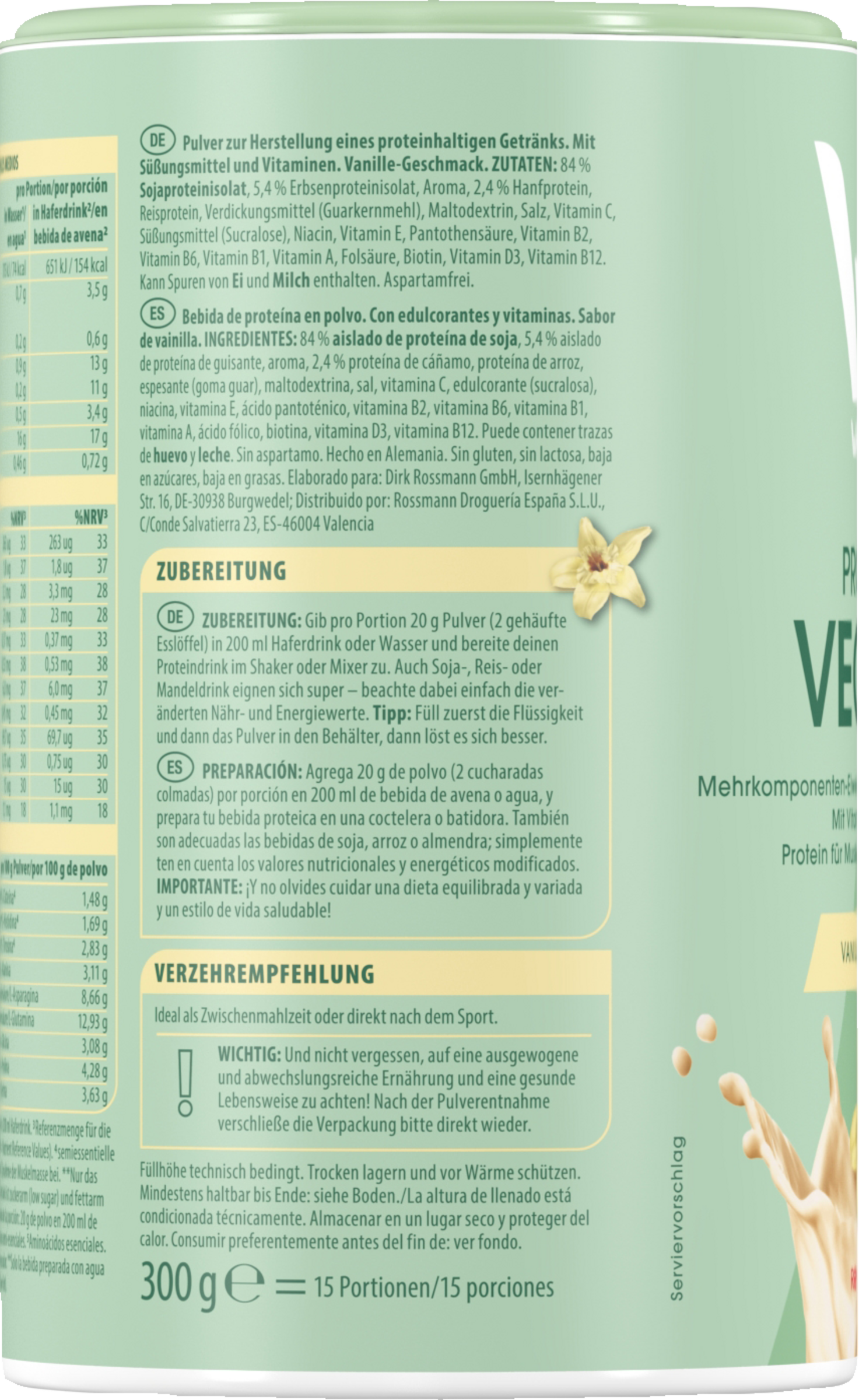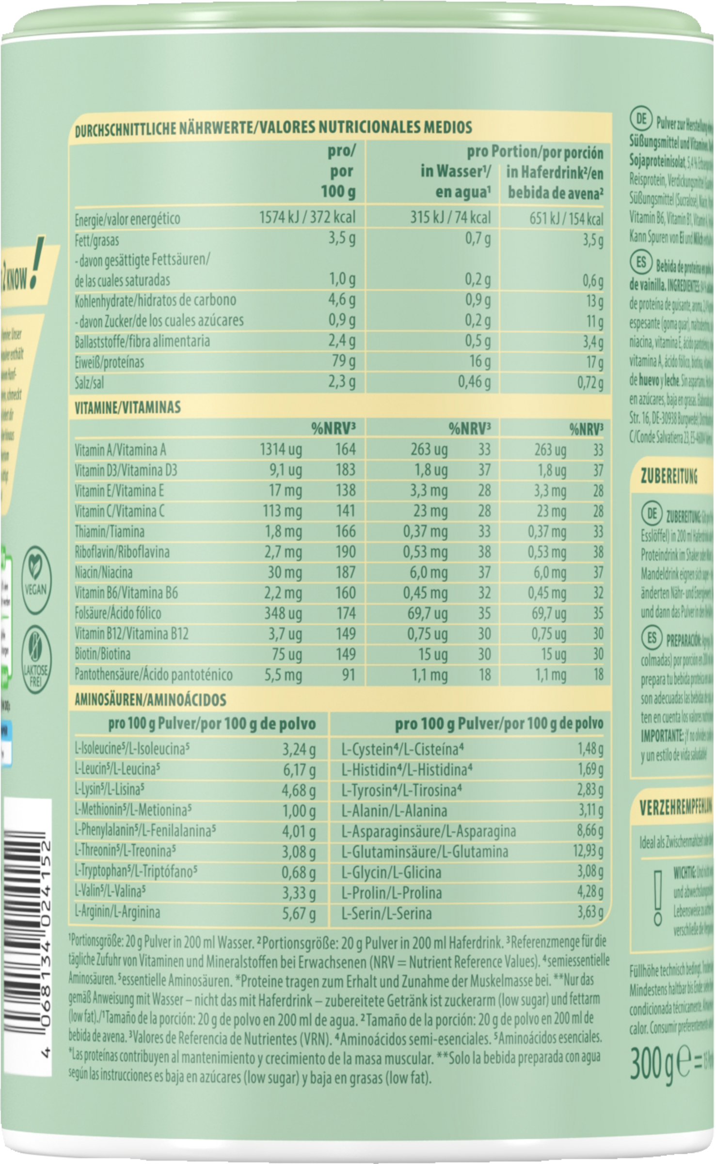84% SOJAproteinisolat, 5,4% Erbsenproteinisolat, Aroma, 2,4% Hanfprotein, Reisprotein, Verdickungsmittel (Guarkernmehl), Maltodextrin, Salz, Vitamin C, Süßungsmittel (Sucralose), Niacin, Vitamin E, Pantothensäure, Vitamin B2, Vitamin B6, Vitamin B1, Vitamin A, Folsäure, Biotin, Vitamin D3, Vitamin B12. Kann Spuren von EI und MILCH enthalten.
