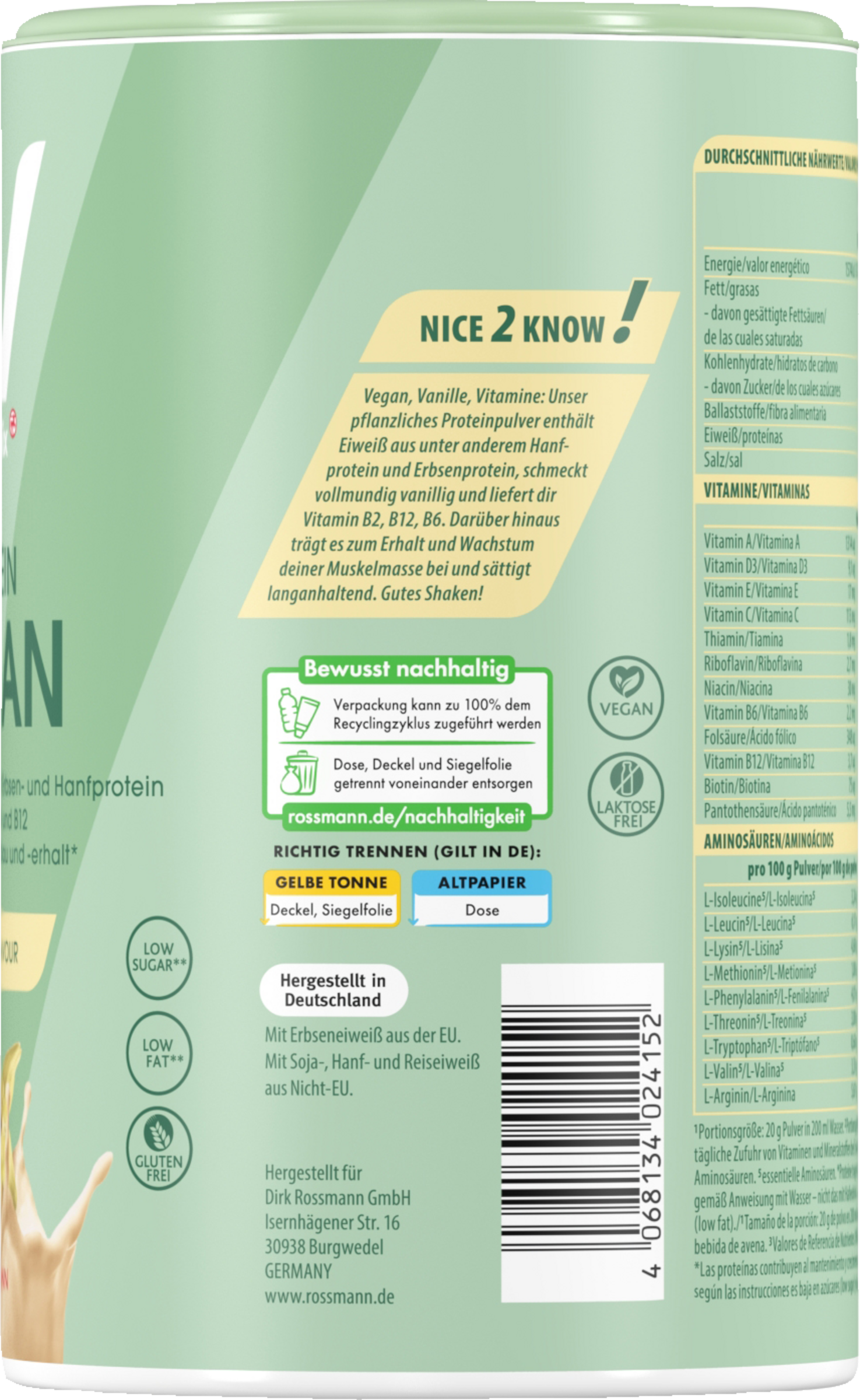 Mit Erbseneiweiß aus der EU. Mit Sojaeiweiß, Hanfeiweiß und Reiseiweiß aus der Nicht-EU.