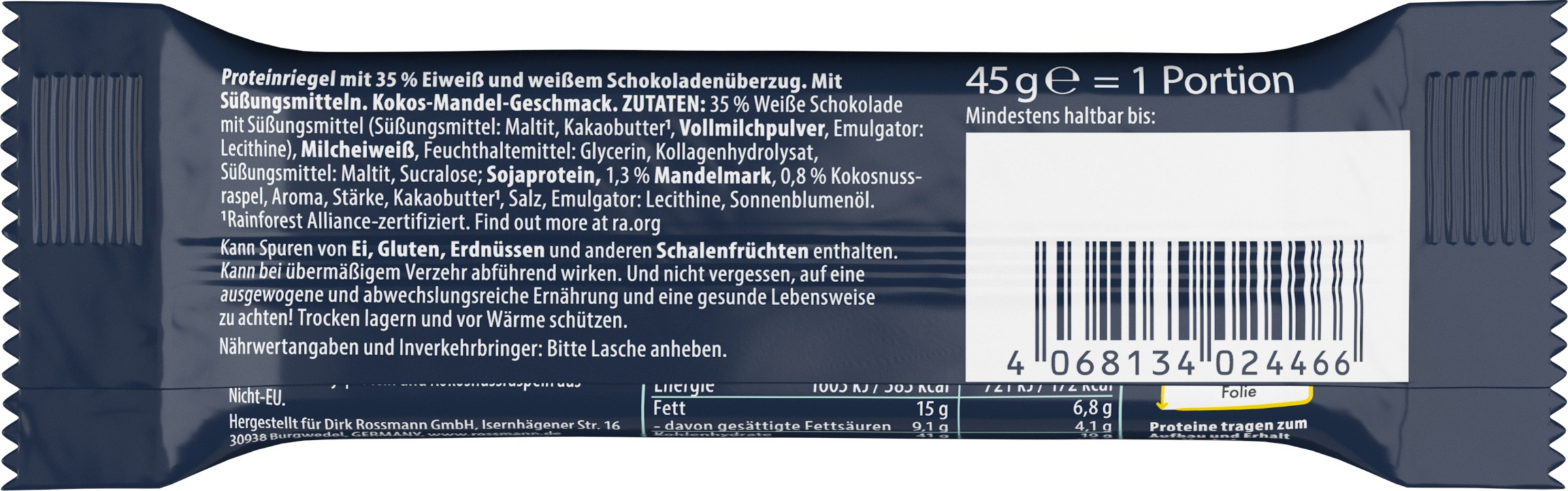 35 % Weiße Schokolade (Süßungsmittel: Maltit, Kakaobutter, VOLLMILCHPULVER, Emulgator: Lecitine), MILCHEIWEIß Feuchthaltemittel: Glycerin; Kollagenhydrolysat, SOJAPROTEIN, Süßungsmittel: Maltit, Sucralose; 1,3 % MANDELMARK, 0,8 % Kokosnussraspeln, Aroma, Stärke, Kakaobutter, Salz, Emulgator: Lecithine; Sonnenblumenöl.