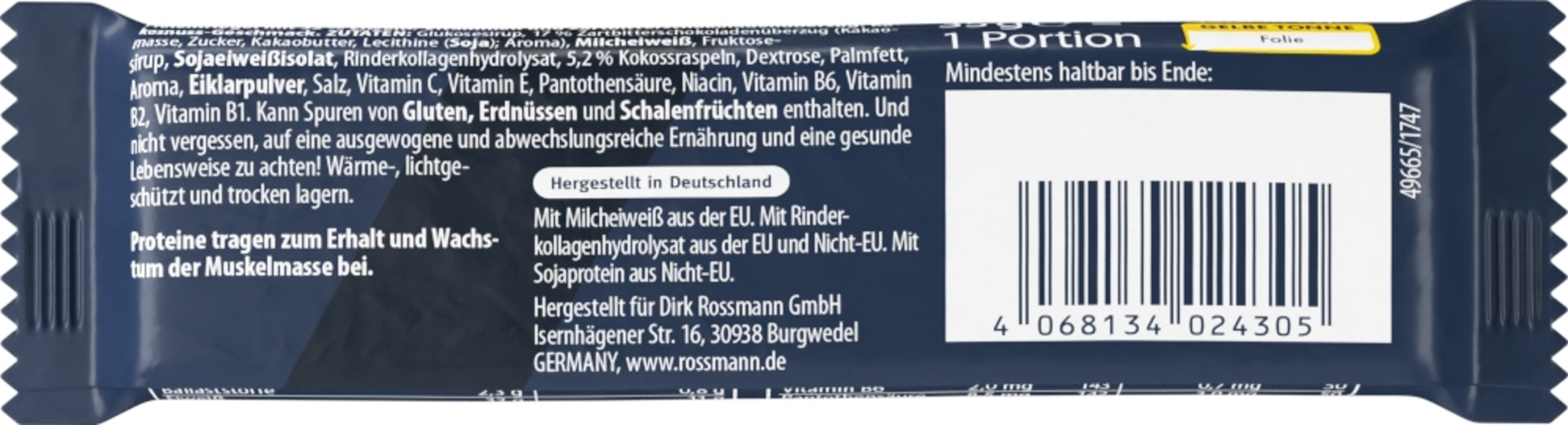 Glukosesirup, 17% ZARTBITTERSCHOKOLADENÜBERZUG (Kakaomasse, Zucker, Kakaobutter, Emulgator SOJALECITHINE, Aroma), MILCHEIWEISS, Fruktosesirup, SOJAEIWEISSISOLAT, Kollagenhydrolysat, 5,2% Kokosraspeln, Dextrose, Palmfett, Aroma, EIKLARPULVER, Salz, L-Ascorbinsäure, DL-alpha-Tocopherol, Calcium-D-Pantothenat, Nicotinamid, Pyridoxinhydrochlorid, Riboflavin, Thiaminhydrochlorid. Kann Spuren von GLUTEN, ERDNÜSSEN und SCHALENFRÜCHTE enthalten.