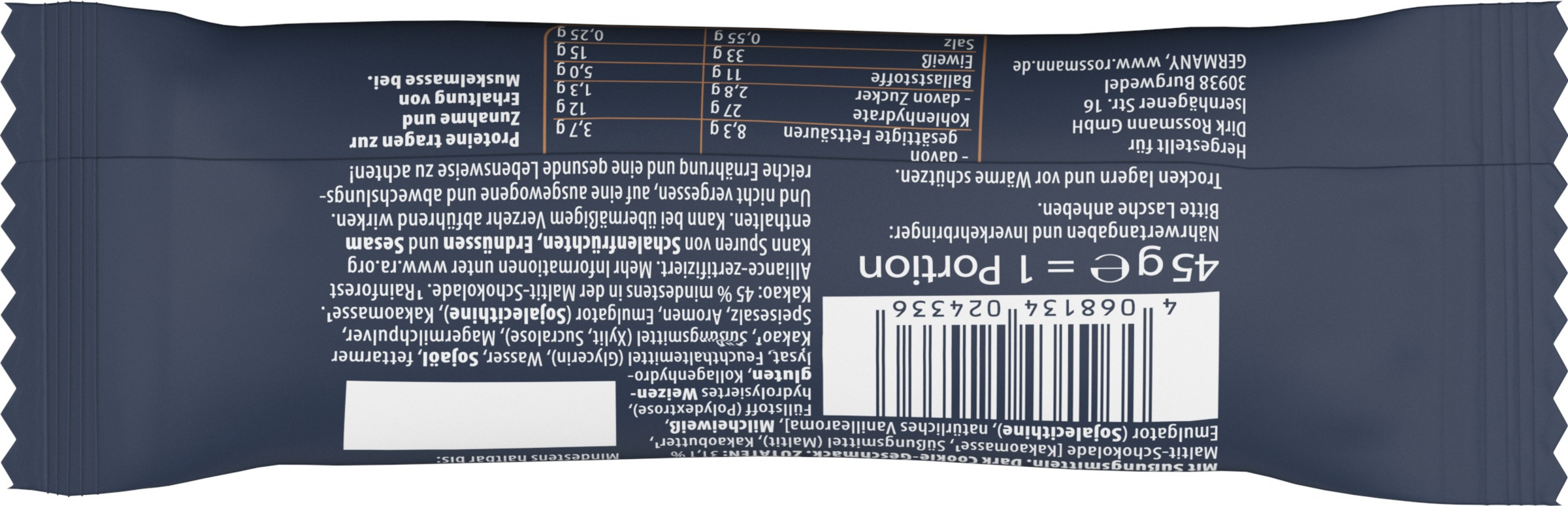 Proteinriegel mit 33% Eiweiß und Maltit-Schokoladenüberzug, mit Süßungsmitteln. Dark Cookie-Geschmack.