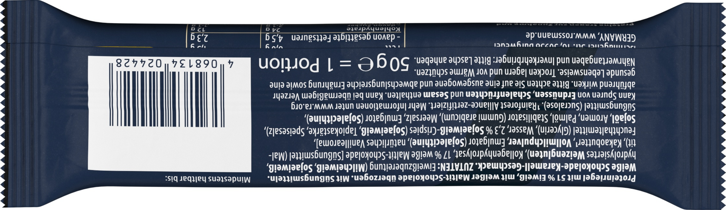 Proteinriegel mit 51% Eiweiß, mit weißer Maltit-Schokolade überzogen. Mit Süßungsmitteln. Weiße Schokolade Karamell-Geschmack.