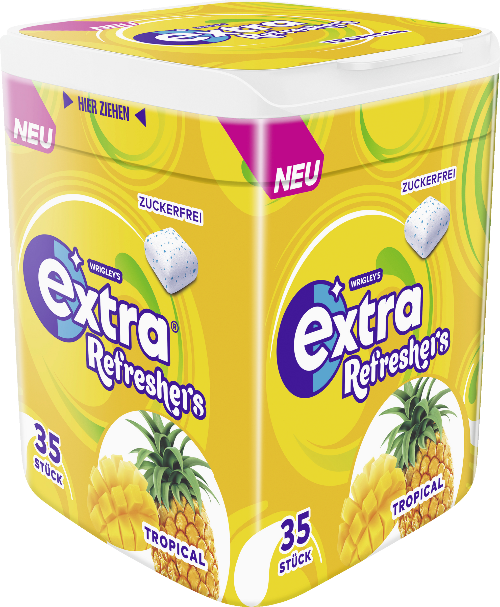 EXTRA® Refreshers Tropical Kaugummi mit Ananas- und Mangogeschmack sorgt für ein erfrischendes Geschmackserlebnis.