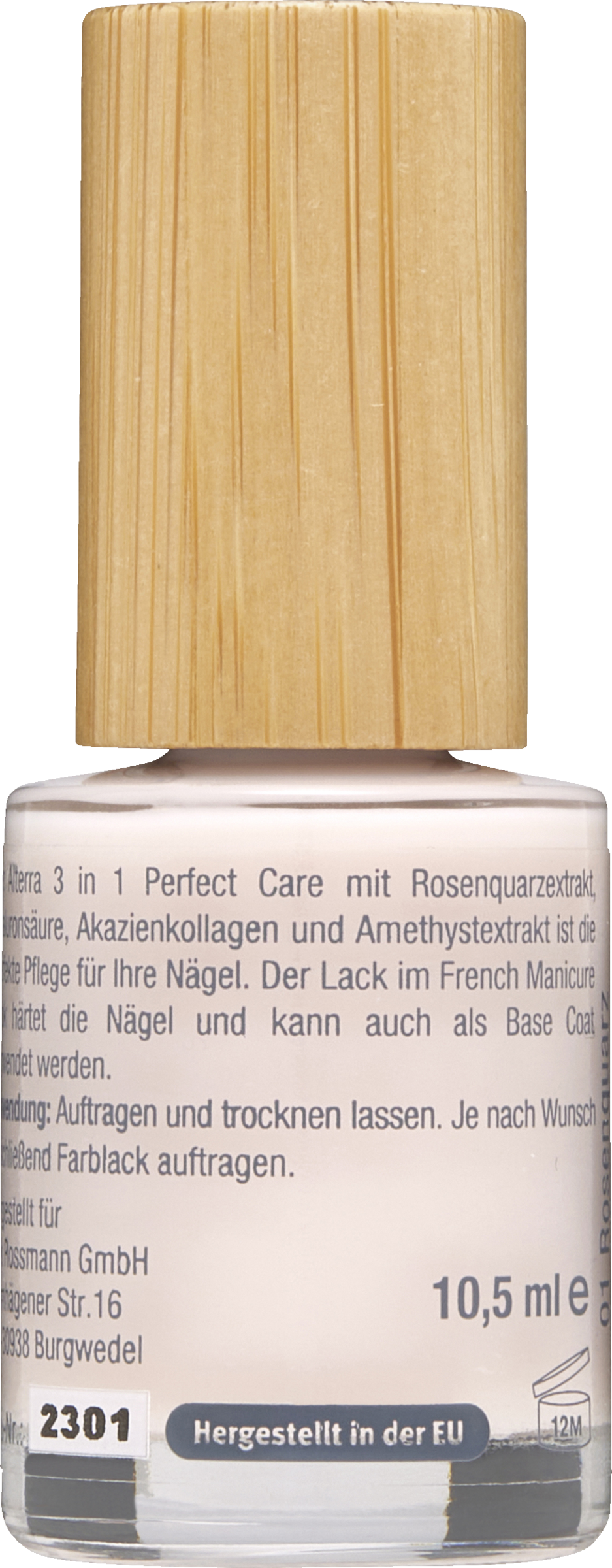 Der Alterra 3 in 1 Perfect Care mit Rosenquarzextrakt, Hyaluronsäure, Akazienkollagen und Amethystextrakt ist die perfekte Pflege für Ihre Nägel. Der Lack im French Manicure Look härtet die Nägel und kann auch als Base Coat verwendet werden.