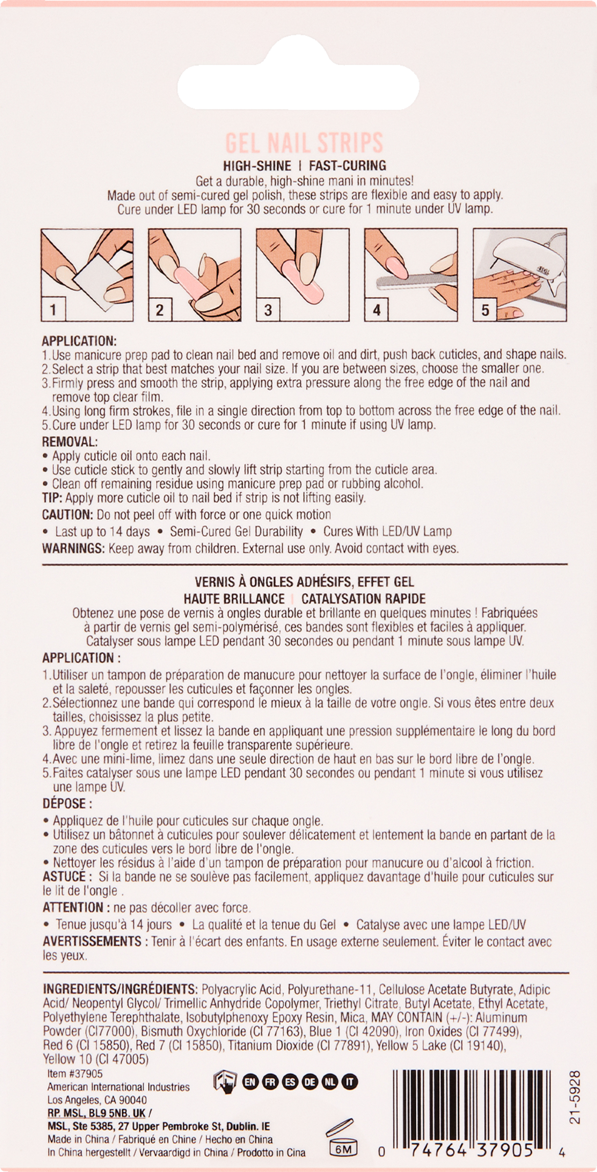 Polyacrylic Acid, Polyurethane-11, Cellulose Acetate Butyrate, Adipic Acid/ Neopentyl Glycol/Trimellic Anhydride Copolymer, Triethyl Citrate, Butyl Acetate, Ethyl Acetate, Polyethylene Terephthalate, Isobutylphenoxy Epoxy Resin, Mica, MAY CONTAIN (+/-): Aluminum Powder (CI77000), Bismuth Oxychloride (CI 77163), Blue 1 (Cl 42090), Iron Oxides (Cl 77499), Red 6 (Cl 15850), Red 7 (CI 15850), Titanium Dioxide (CI 77891), Yellow 5 Lake (CI 19140), Yellow 10 (CI 47005).