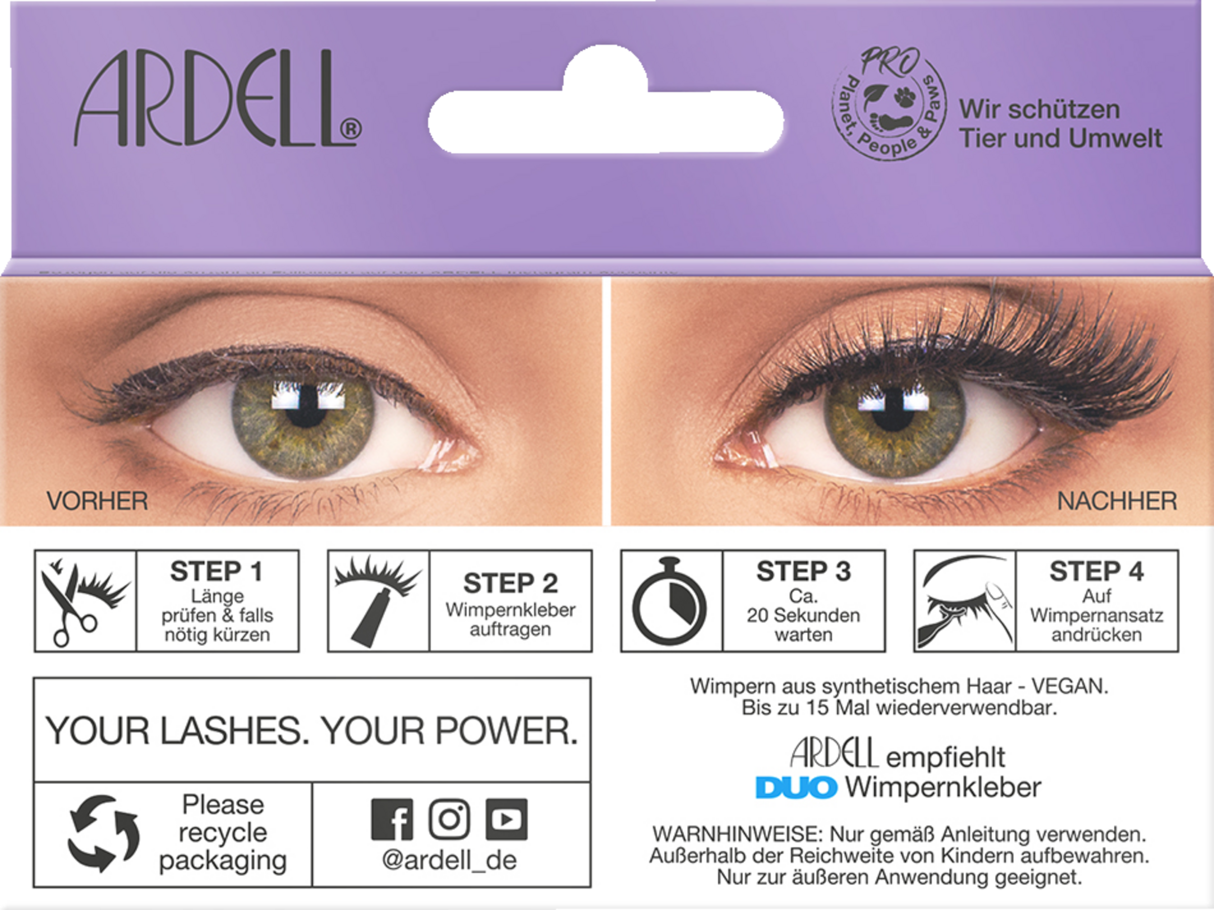 Mit einzigartiger Neverflat-Curl-Technologie sorgen die Mega Volume Lashes 260 von ARDELL für einen unglaublich voluminösen Wimpern-Look, den du dank ultraleichtem und flexiblem Design nicht spürst! Die mehrlagigen Lashes mit spitz zulaufenden Härchen und erweitertem 3D-Effekt verleihen Länge, Schwung und Volumen und sorgen mit nach außen hin länger werdenden Wimpern für einen verführerischen Cat-Eye-Look! Dank der Invisiband-Technologie ist das Wimpernband außerdem kaum sichtbar. Die Mega Volume Lashes können bis zu 15 Mal wiederverwendet werden. Nicht zuletzt sind die Wimpern vegan und cruelty-free.