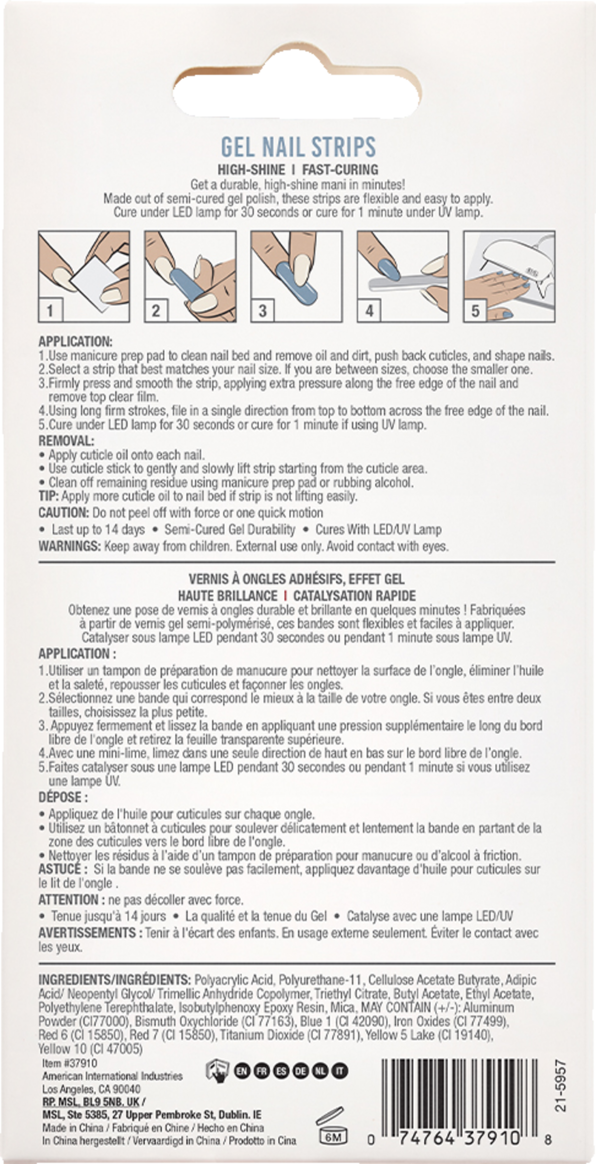 Eine dauerhafte, hochglänzende Maniküre in wenigen Minuten! Diese Streifen bestehen aus echtem, halb ausgehärtetem Gel-Nagellack und sind flexibel und einfach aufzutragen. Aushärtung unter LED-Lampe für 30 Sekunden oder Aushärtung für 1 Minute unter UV-Lampe.