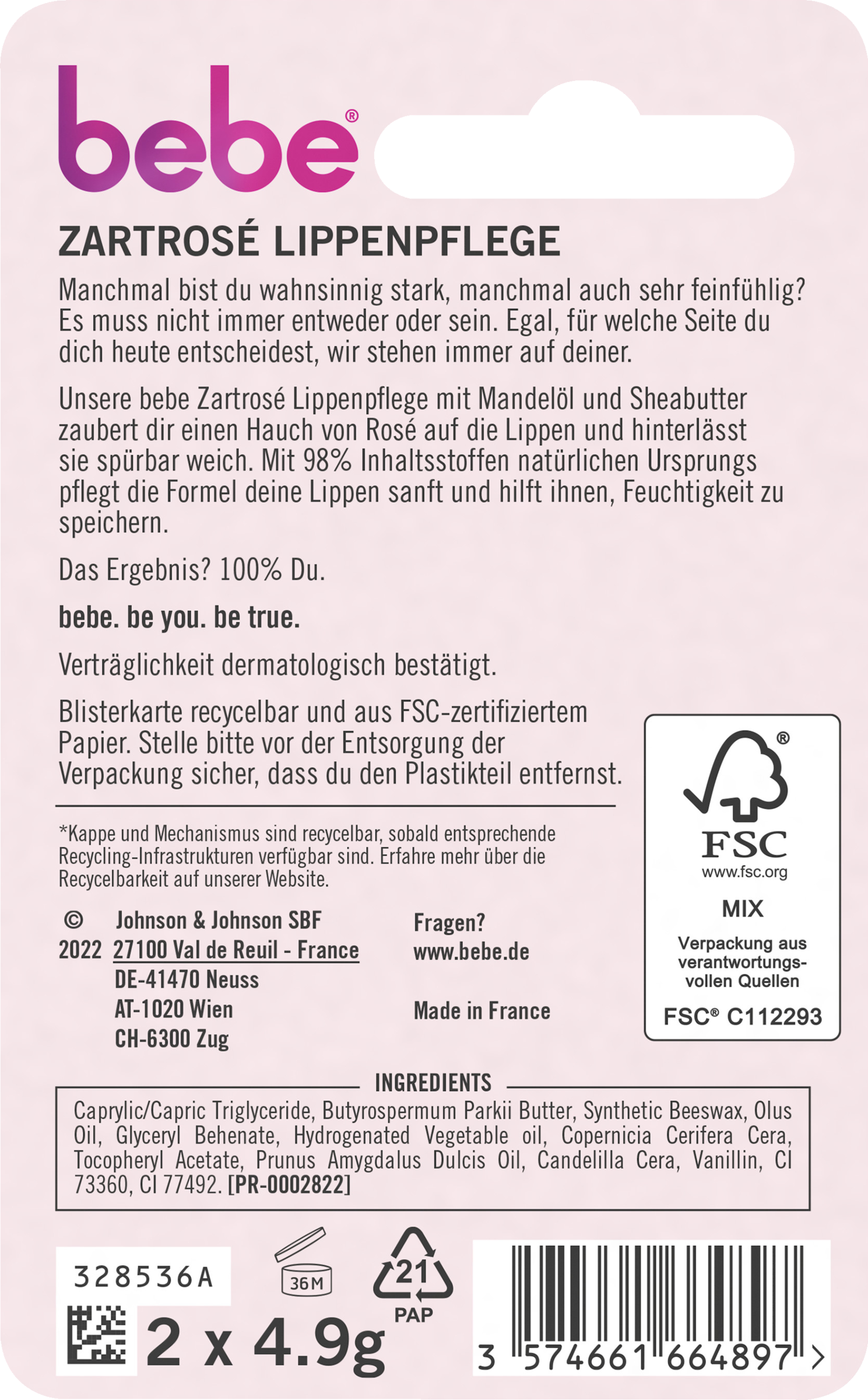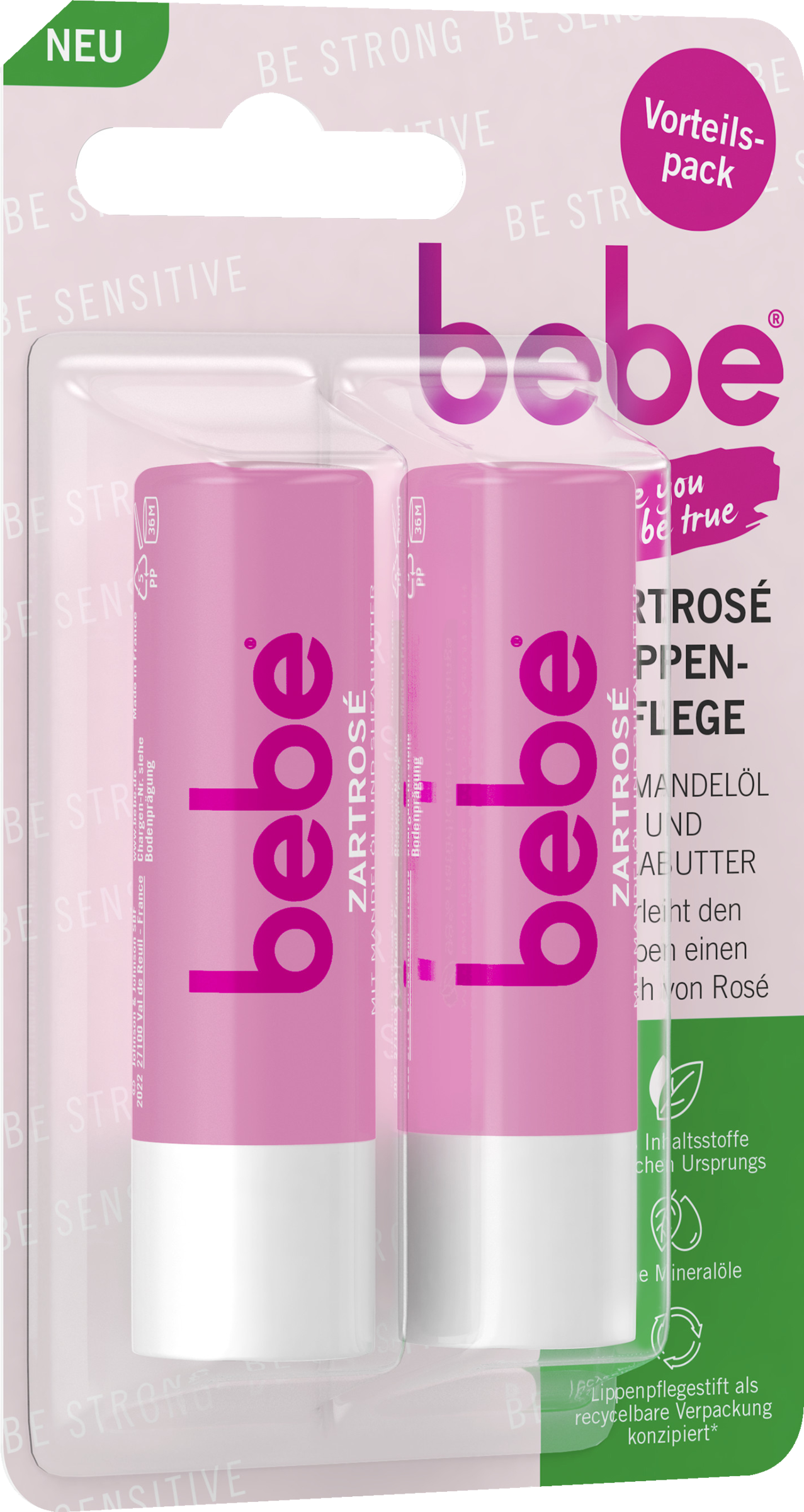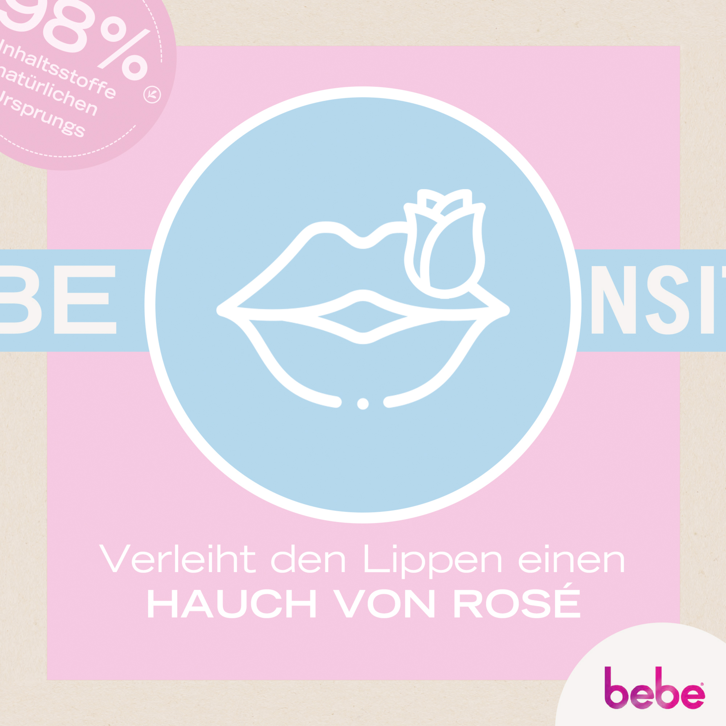Manchmal bist du wahnsinnig stark, manchmal auch sehr feinfühlig? Es muss nicht immer entweder oder sein. Die bebe® Zartrose Lippenpflege mit Mandelöl und Sheabutter zaubert dir einen Hauch von Rosé auf die Lippen und hinterlässt sie spürbar weich.
