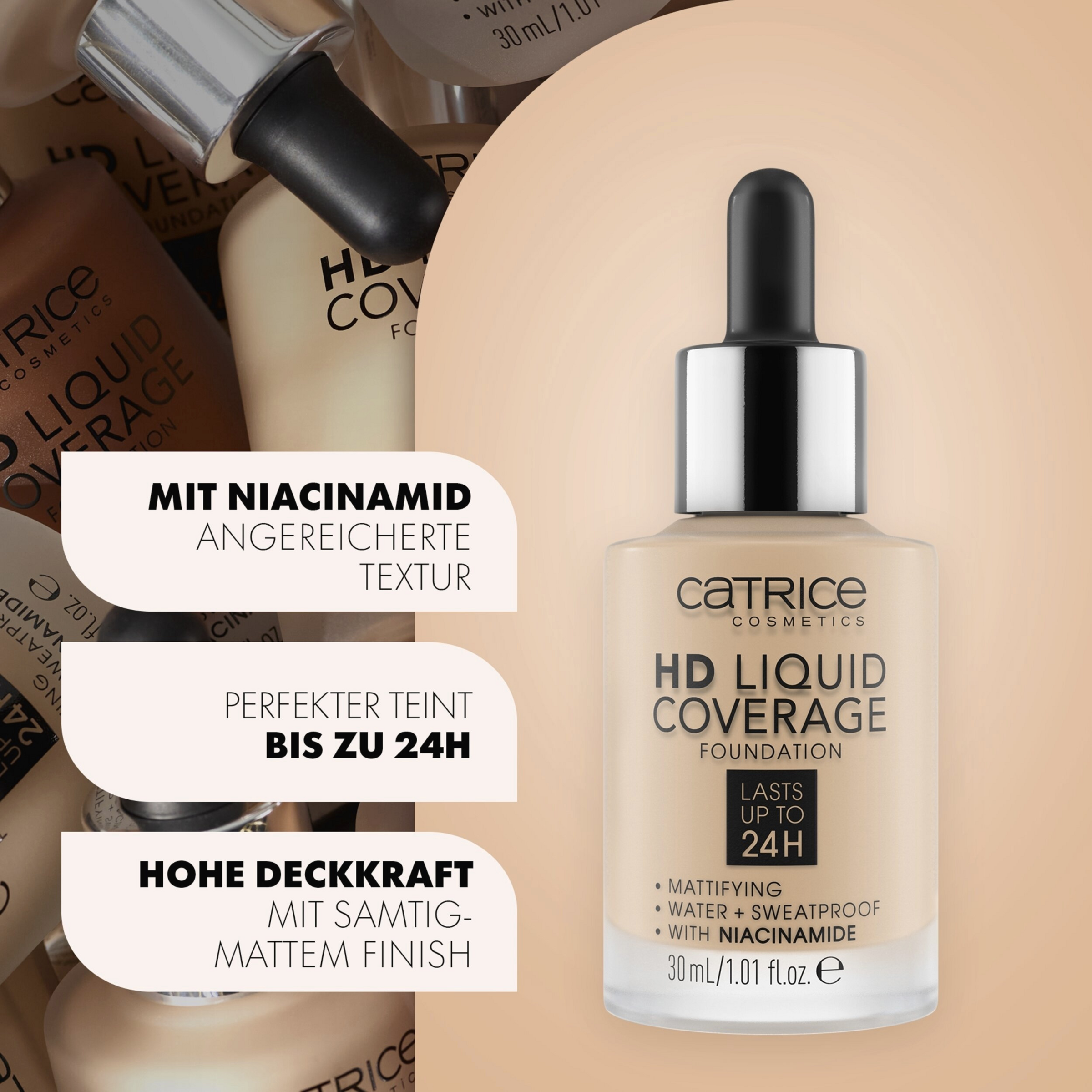 Second Skin Effect: Die HD Liquid Coverage Foundation fühlt sich an wie eine zweite Haut und verleiht einen samtig-mattierten, perfektionierten Teint – bis zu 24 Stunden lang! Die ultra-leichte, flüssige Textur mit hoher und gleichzeitig natürlich aussehender Deckkraft kaschiert Unreinheiten, pflegt mit hautperfektionierendem Niacinamid und ist zusätzlich wasser- und schweißfest sowie transferproof. Die Formel ist außerdem ohne Parabene und Mikroplastikpartikel.