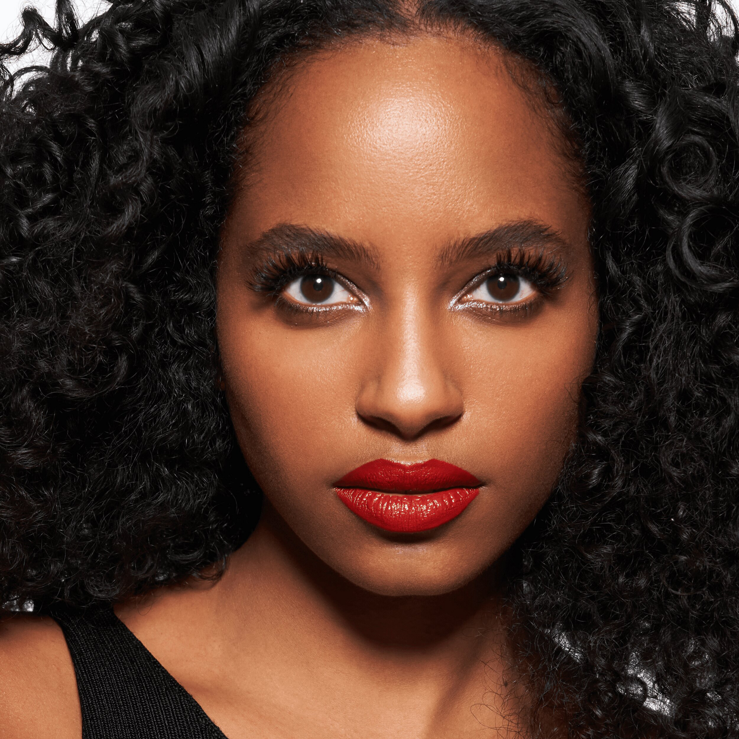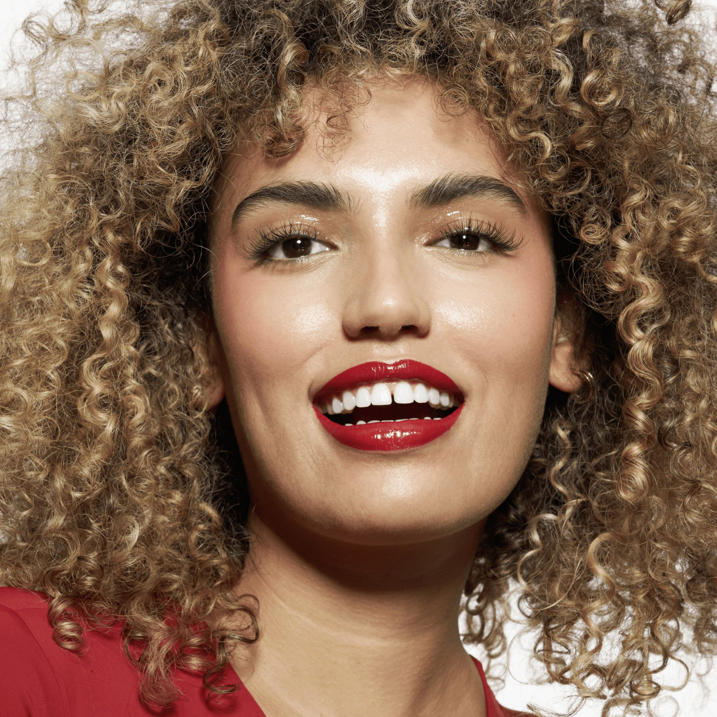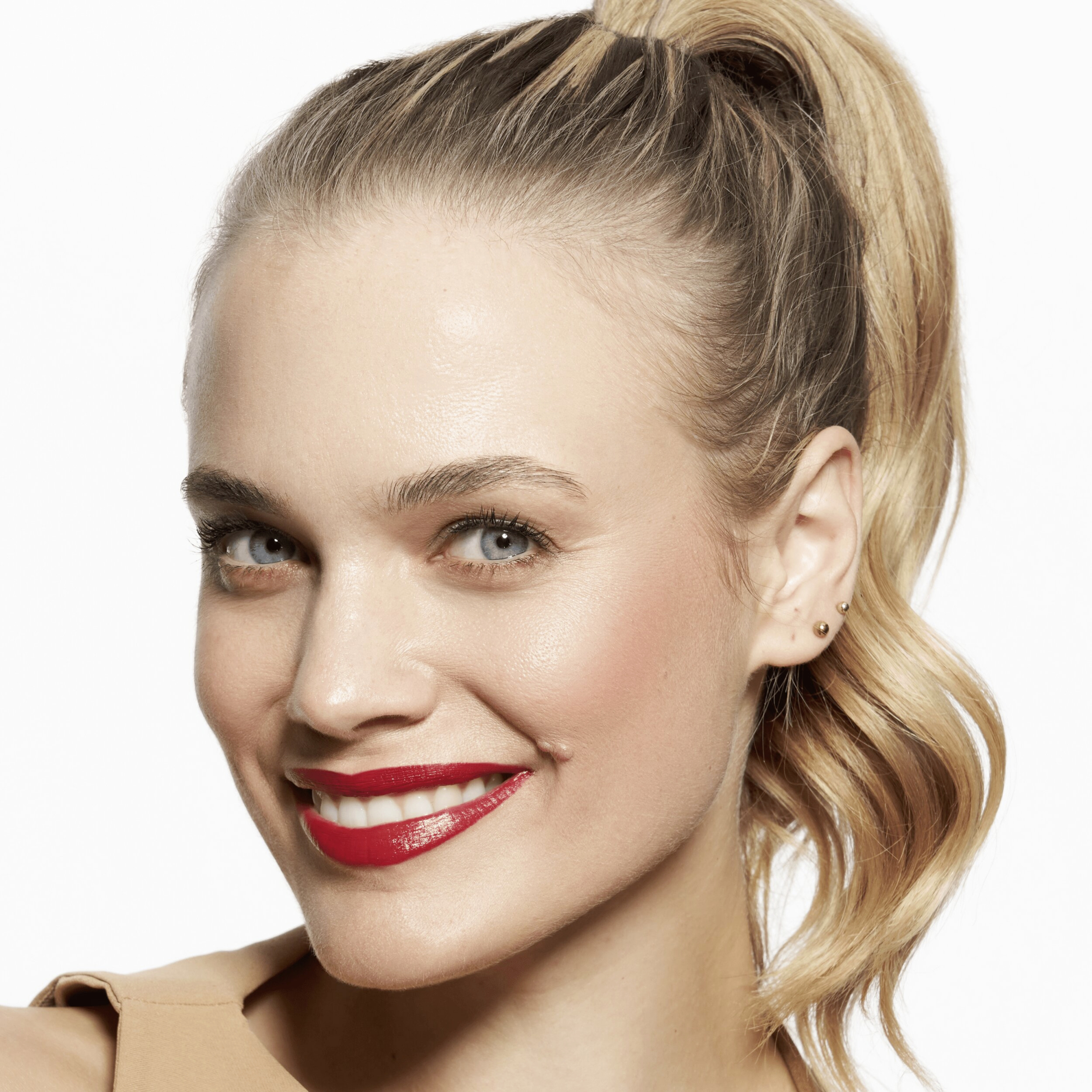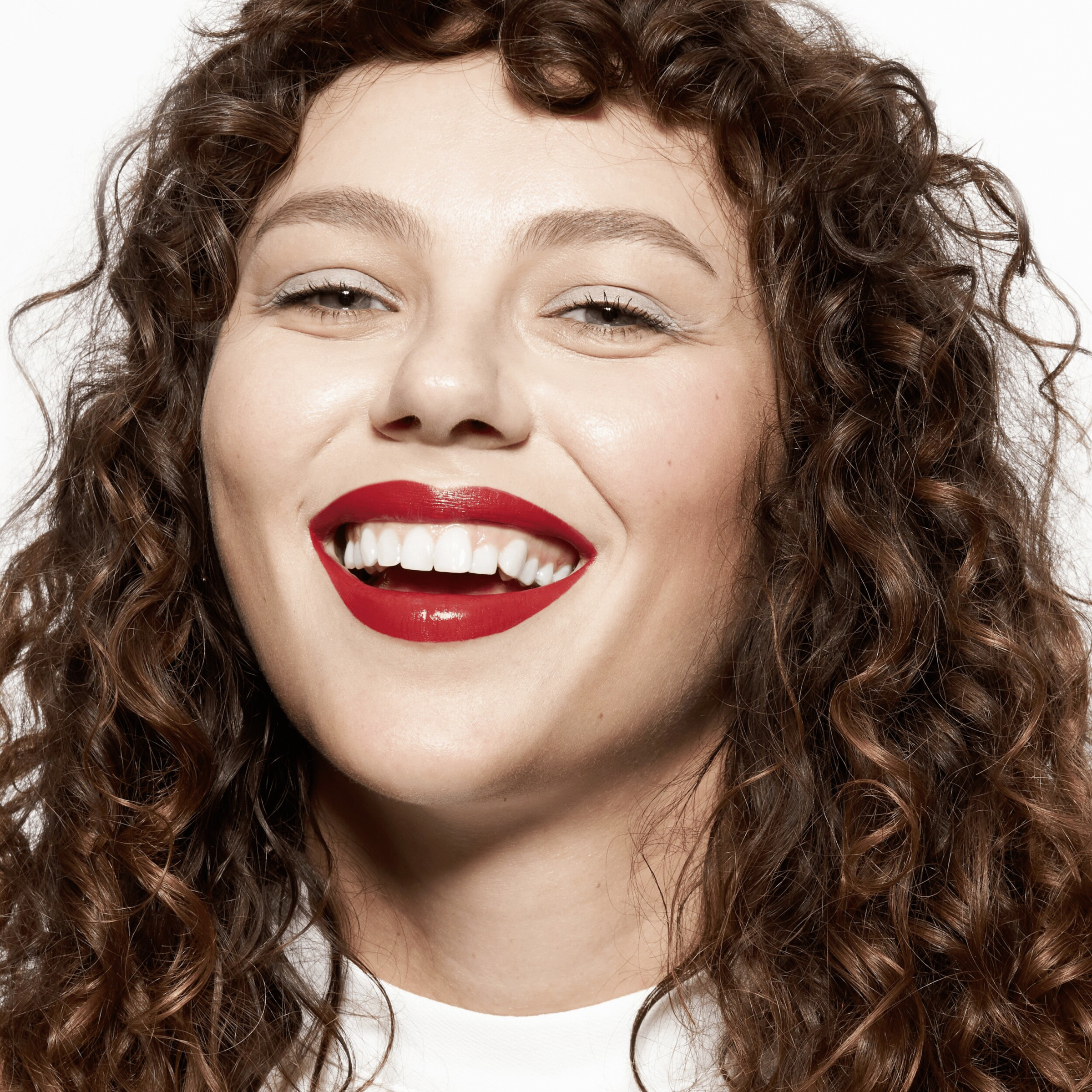 Trage den roten Lippenstift zuerst auf der einen und dann auf der anderen Hälfte auf. Auf der Unterlippe klappt das Auftragen in einem Zug. Lass ihn kurz antrocknen und fertig ist dein Look.