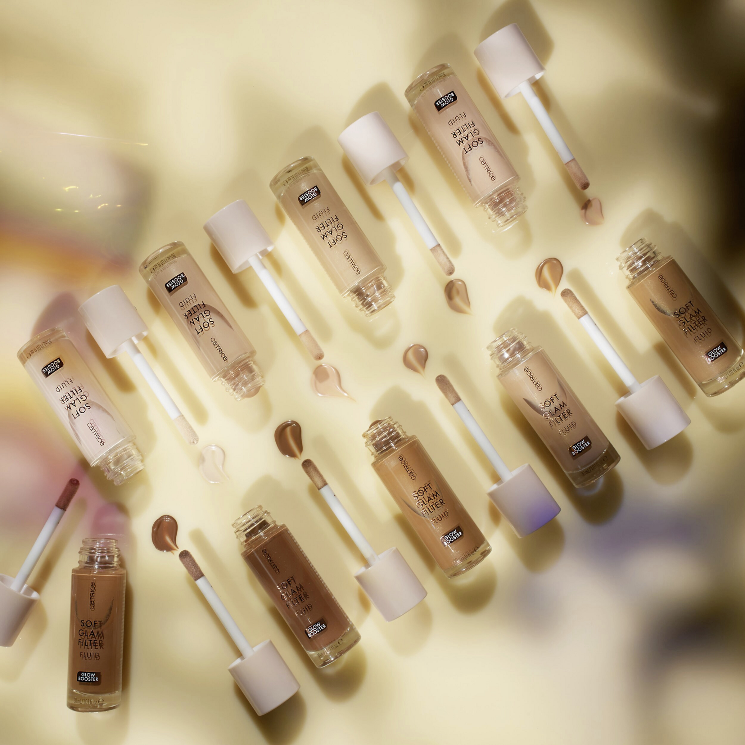 Das sanft getönte, illuminierende CATRICE Soft Glam Filter Fluid verleiht einen „Soft Glam Filter“- Effekt für einen weichgezeichneten, perfektionierten und strahlenden Teint. Und ist dabei ein echter Allrounder: Es kann alleine auftragen werden, als Primer unter dem Make-up oder darüber oder um gezielt Highlights zu setzen. Außerdem pflegt die Formulierung mit Vitamin E und Squalan die Haut und spendet Feuchtigkeit.