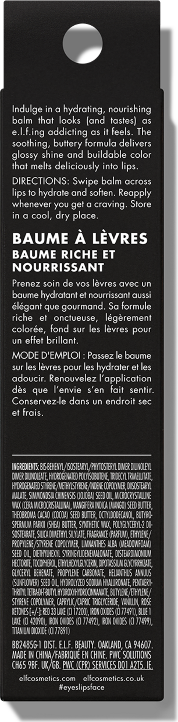 Bis-Behenyl/Isostearyl/Phytosteryl Dimer Dilinoleyl Dimer Dilinoleate, Hydrogenated Polyisobutene, Tridecyl Trimellitate, Hydrogenated Styrene/Methylstyrene/Indene Copolymer, Diisostearyl Malate, Simmondsia Chinensis (Jojoba) Seed Oil, Microcrystalline Wax (Cera Microcristallina), Mangifera Indica (Mango) Seed Butter, Theobroma Cacao (Cocoa) Seed Butter, Octyldodecanol, Butyrospermum Parkii (Shea) Butter, Synthetic Wax, Polyglyceryl-2 Diisostearate, Silica Dimethyl Silylate, Fragrance (Parfum), Ethylene/Propylene/Styrene Copolymer, Limnanthes Alba (Meadowfoam) Seed Oil, Diethylhexyl Syringylidenemalonate, Disteardimonium Hectorite, Tocopherol, Ethylhexylglycerin, Dipotassium Glycyrrhizate, Glyceryl Behenate, Propylene Carbonate, Helianthus Annuus (Sunflower) Seed Oil, Hydrolyzed Sodium Hyaluronate, Pentaerythrityl Tetra-di-t-butyl Hydroxyhydrocinnamate, Butylene/Ethylene/Styrene Copolymer, Caprylic/Capric Triglyceride, Linalool, Limonene, Geraniol, May Contain: Red 28 Lake (CI 45410), Yellow 5 Lake (CI 19140), Red 7 Lake (CI 15850), Titanium Dioxide (CI 77891), Iron Oxides (CI 77499)