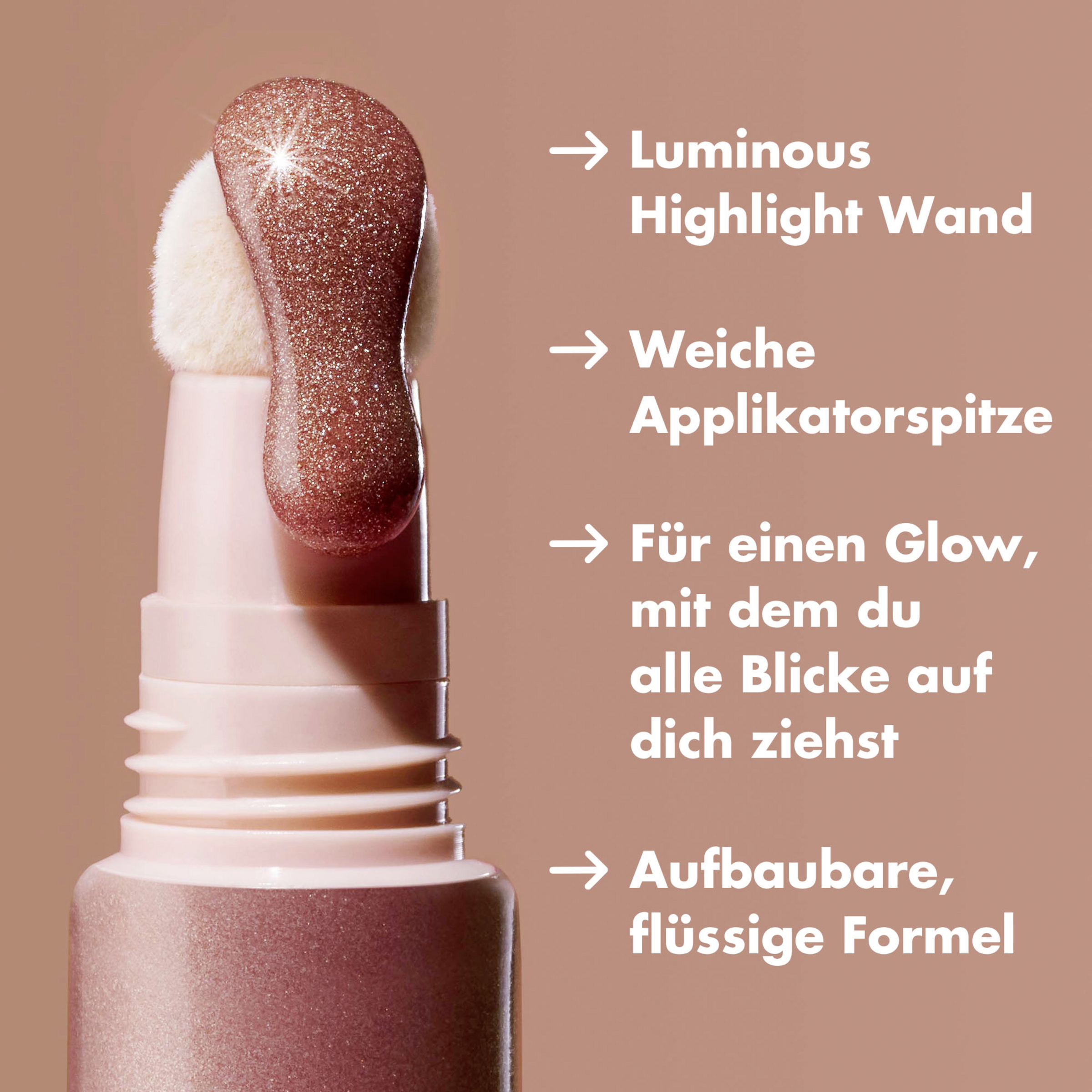 Ein flüssiger Highlighter Wand mit weichem Applikator, der deinem Teint einen strahlenden Glow verleiht.
