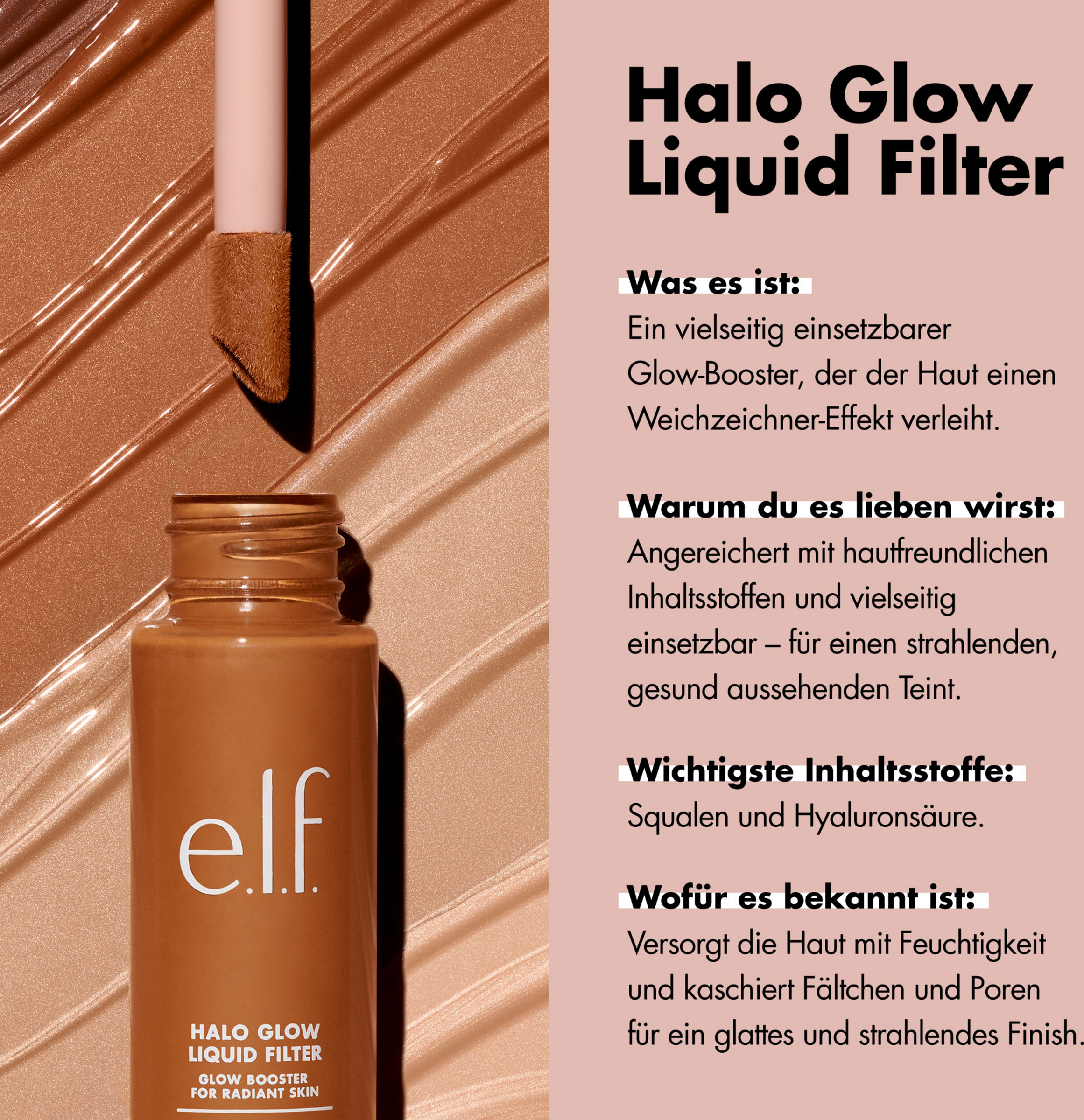 Elf hat auf eure Wünsche gehört – der Halo Glow Liquid Filter ist jetzt in 12 Farbtönen erhältlich, passend zu einer Vielzahl von Hauttönen und Untertönen! Dieser innovative Teint-Booster und Hautpflege-Make-up-Hybrid ist mit Squalan und Hyaluronsäure angereichert. Die einzigartige Formel verbessert das Hautbild und sorgt gleichzeitig für einen strahlenden Weichzeichner-Effekt. Trage sie allein, unter oder über dem Make-up, mische sie mit deiner Lieblings-Foundation für ein taufrisches Finish oder verwende sie als Highlighter, um hervorstehende Gesichtspartien in Szene zu setzen. Erhältlich in 12 flexiblen Farbtönen.