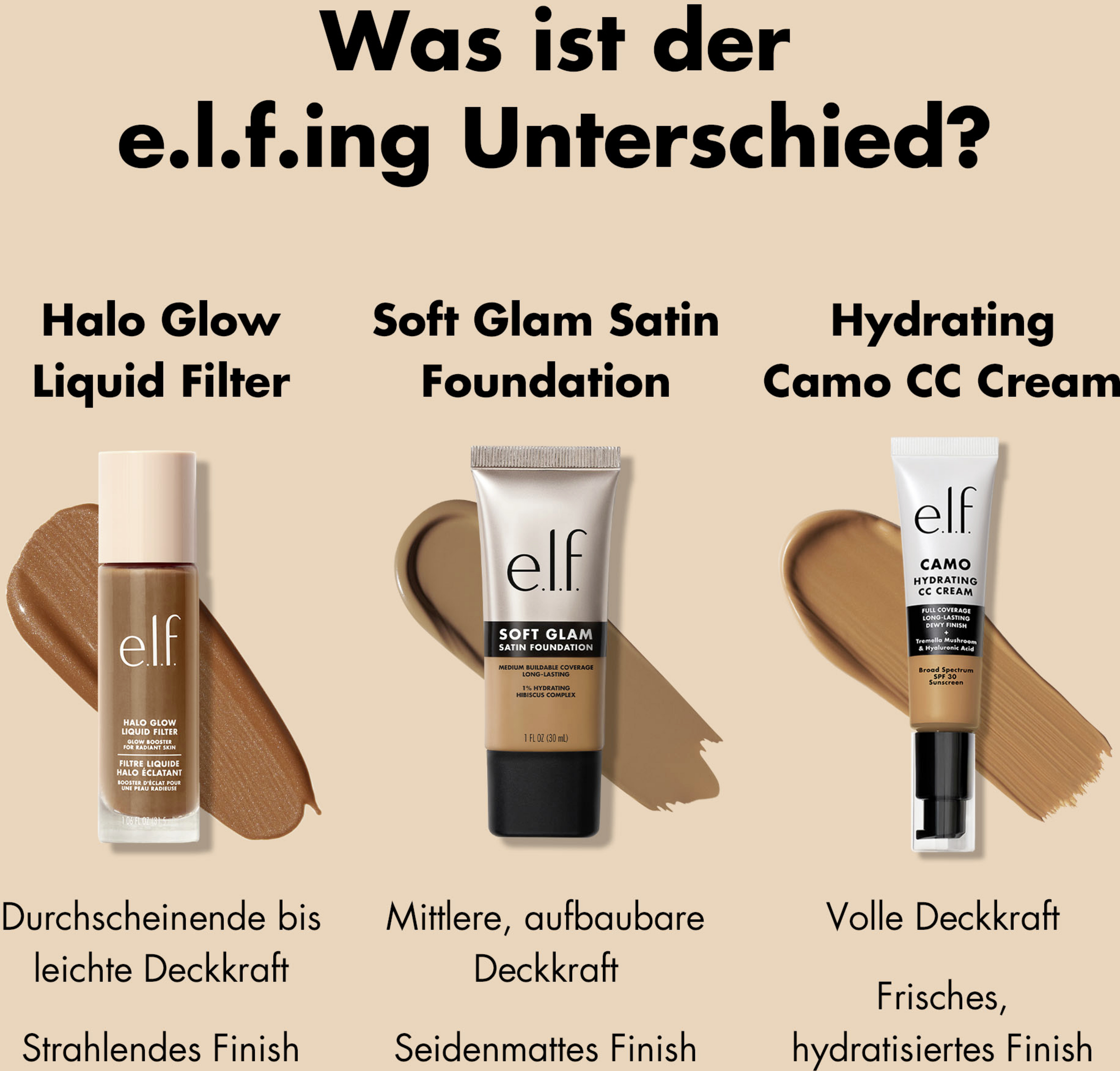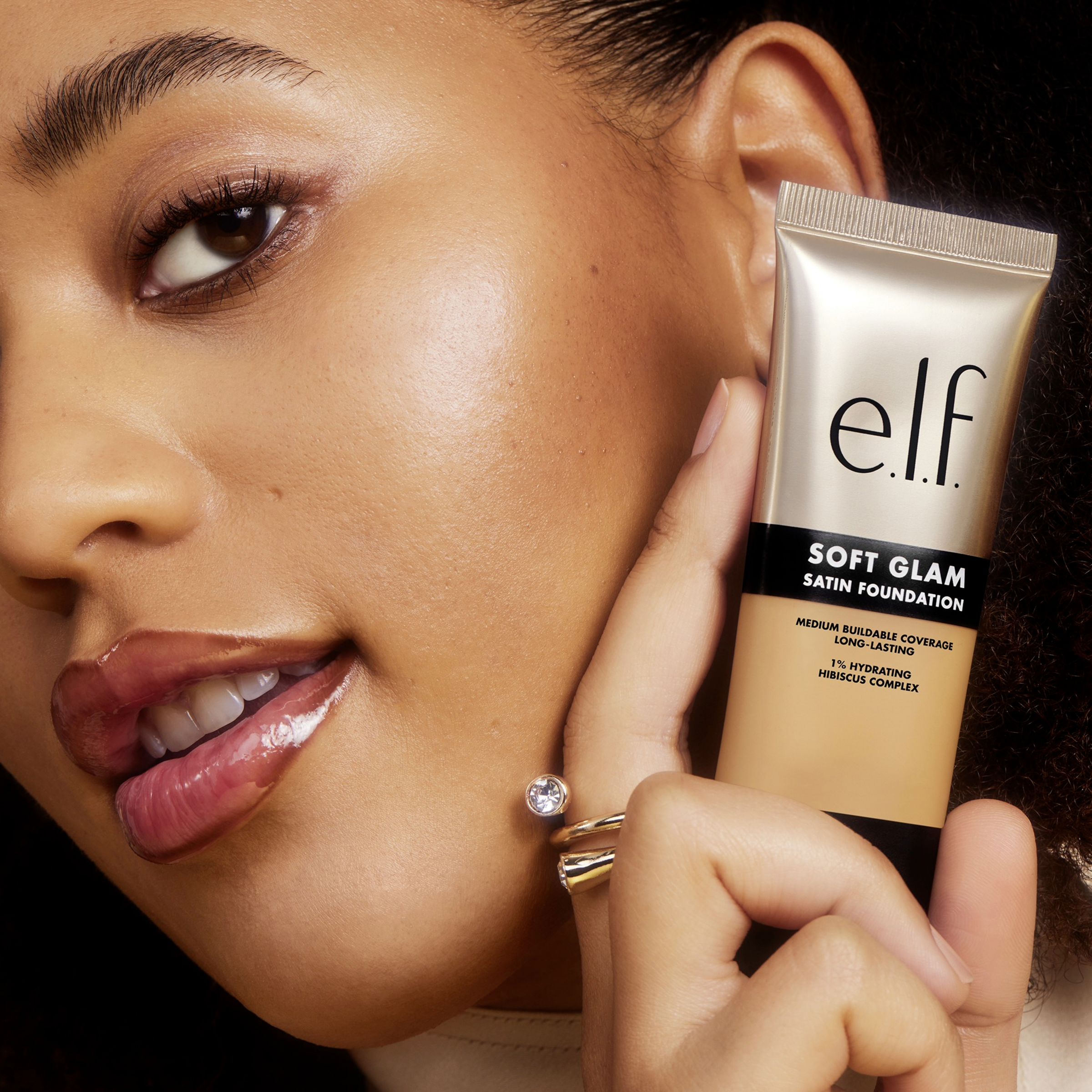 Erziele mit der langanhaltenden Soft Glam Satin Foundation von e.l.f. Cosmetics den perfekten Sweetspot zwischen hochgradiger und hauchzarter Abdeckung. Die mit 1 % Hydrating Hibiscus Complex und Fruchtextrakten angereicherte Flüssig-Foundation verstopft die Poren nicht und fühlt sich so gut an, wie sie aussieht – kein Cakey-Effekt oder Schweregefühl, nur seidig glatte Haut.