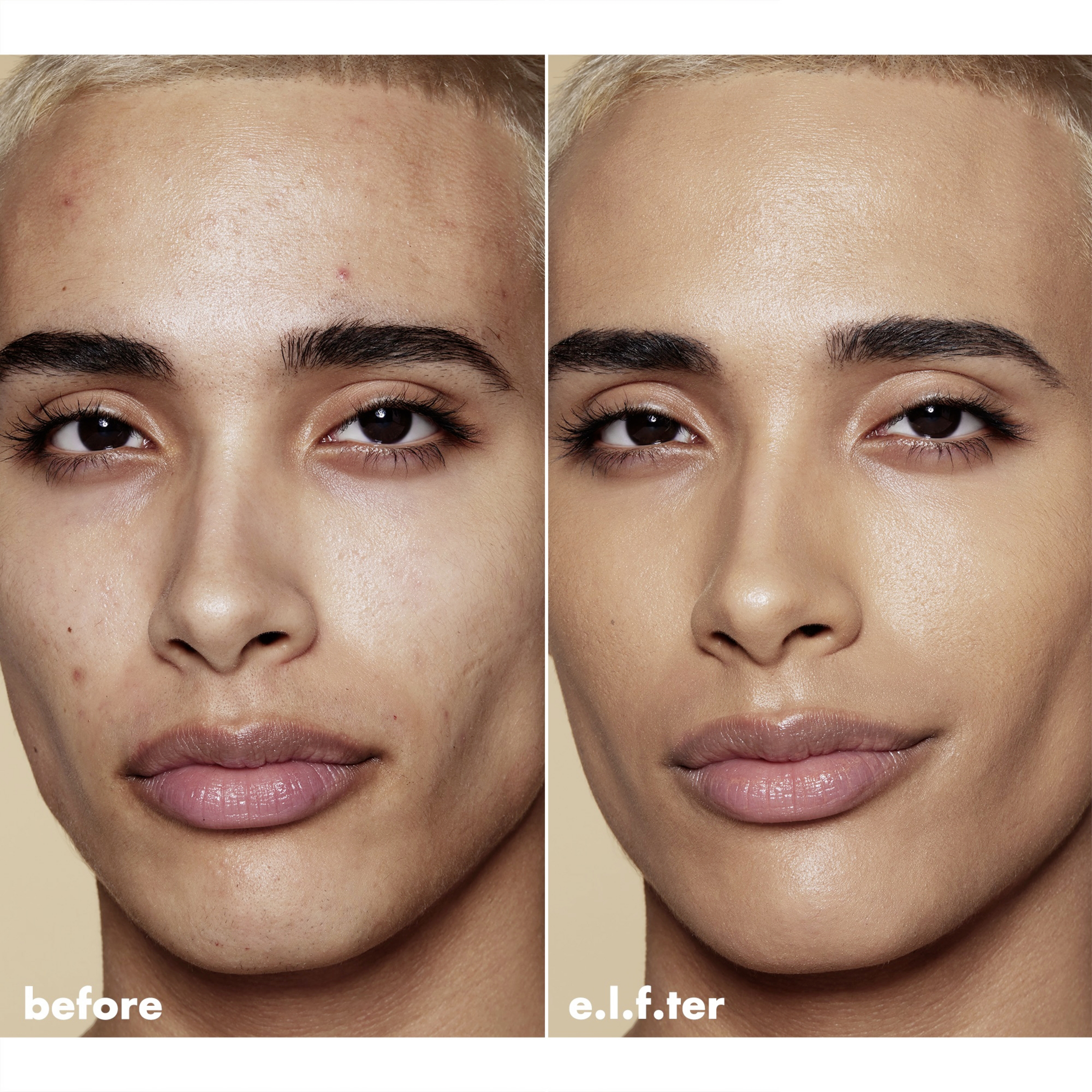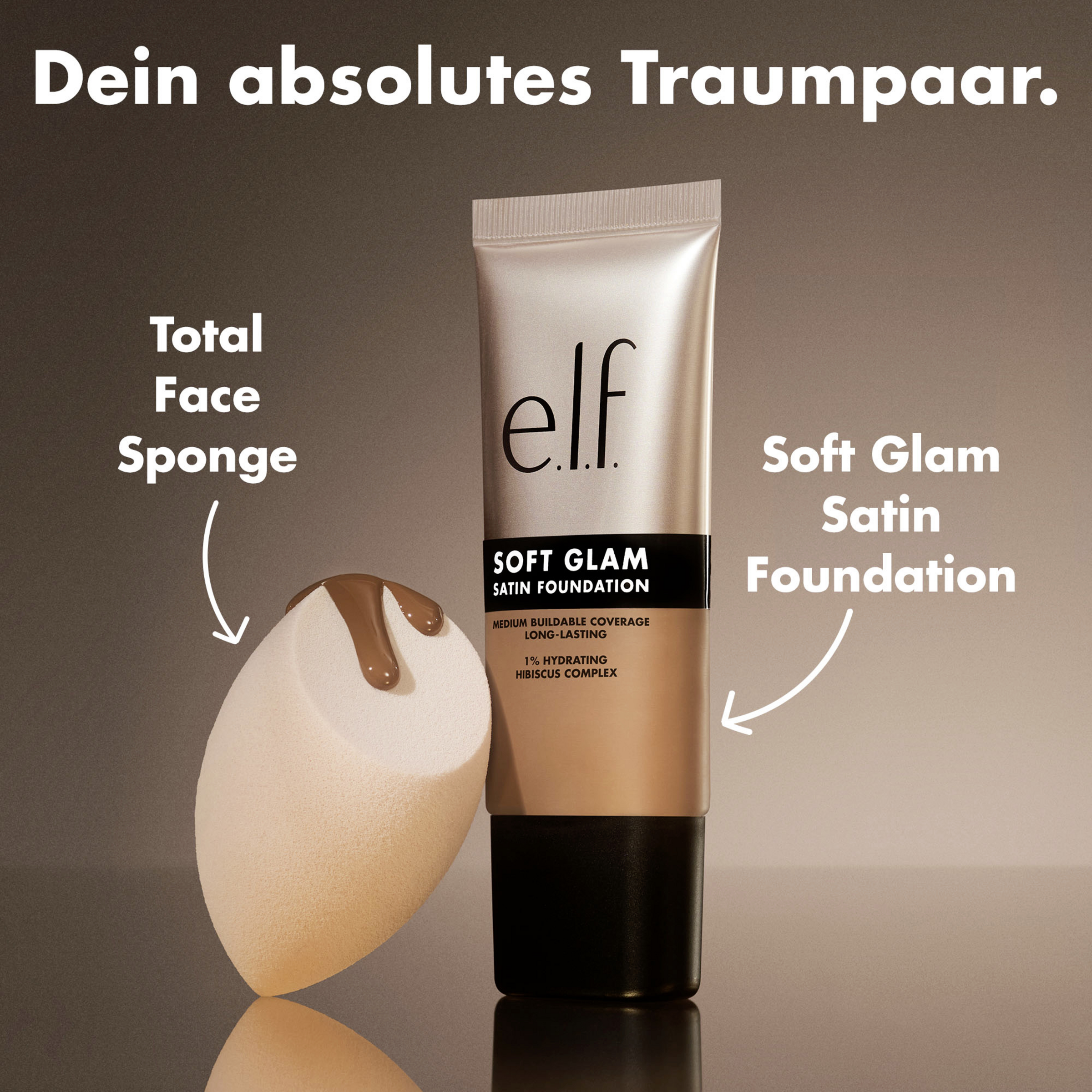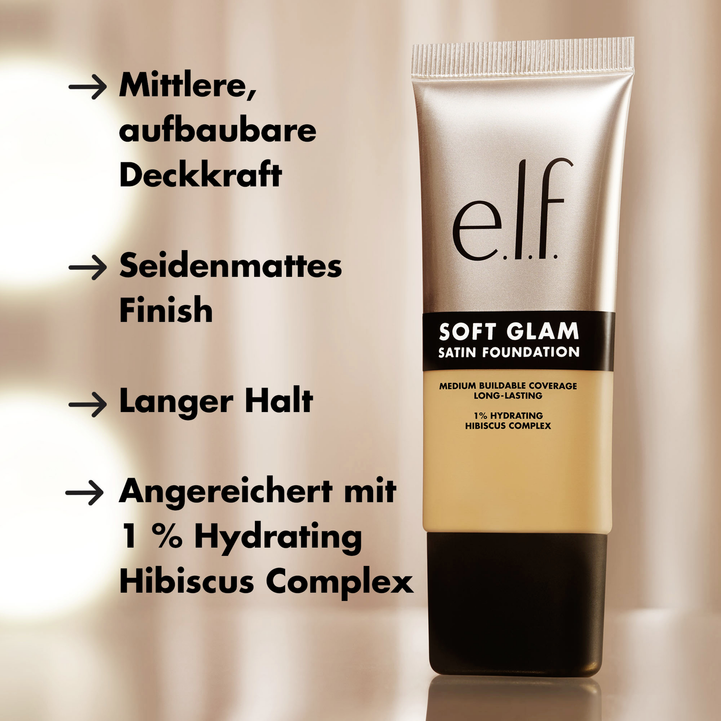Erziele mit der langanhaltenden Soft Glam Satin Foundation von e.l.f. Cosmetics den perfekten Sweetspot zwischen hochgradiger und hauchzarter Abdeckung. Die mit 1 % Hydrating Hibiscus Complex und Fruchtextrakten angereicherte Flüssig-Foundation verstopft die Poren nicht und fühlt sich so gut an, wie sie aussieht – kein Cakey-Effekt oder Schweregefühl, nur seidig glatte Haut.