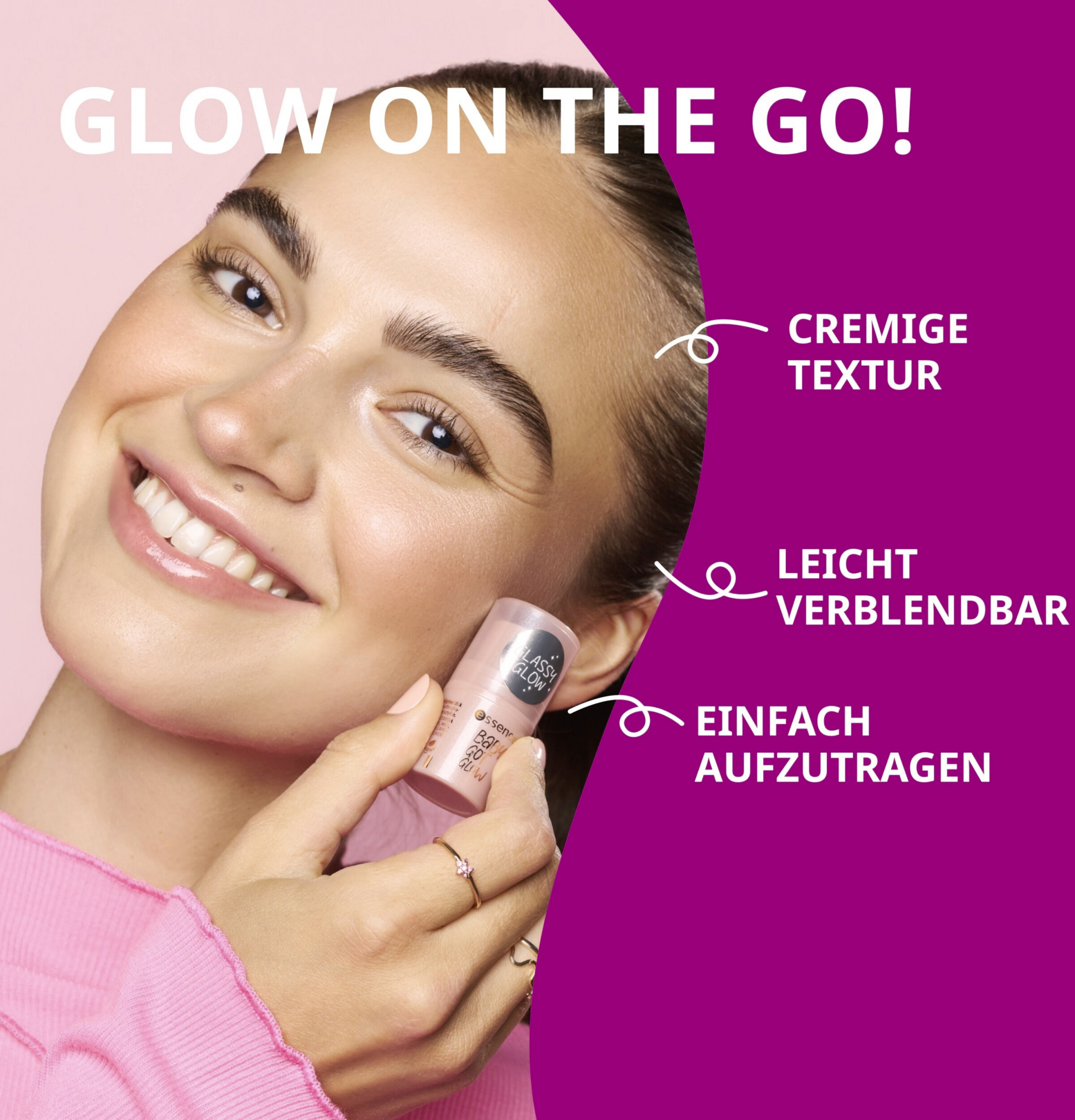 Für sofortige Glow-up-Momente direkt mit dem Stick auftragen. Alternativ mit Pinsel, Beauty-Blender oder den Fingerspitzen aufnehmen und sanft auf die Haut tupfen. Weich auf den Wangenknochen, dem Nasenrücken oder unter den Brauen verblenden: Also überall, wo das Licht den Glassy-Glow einfangen soll.