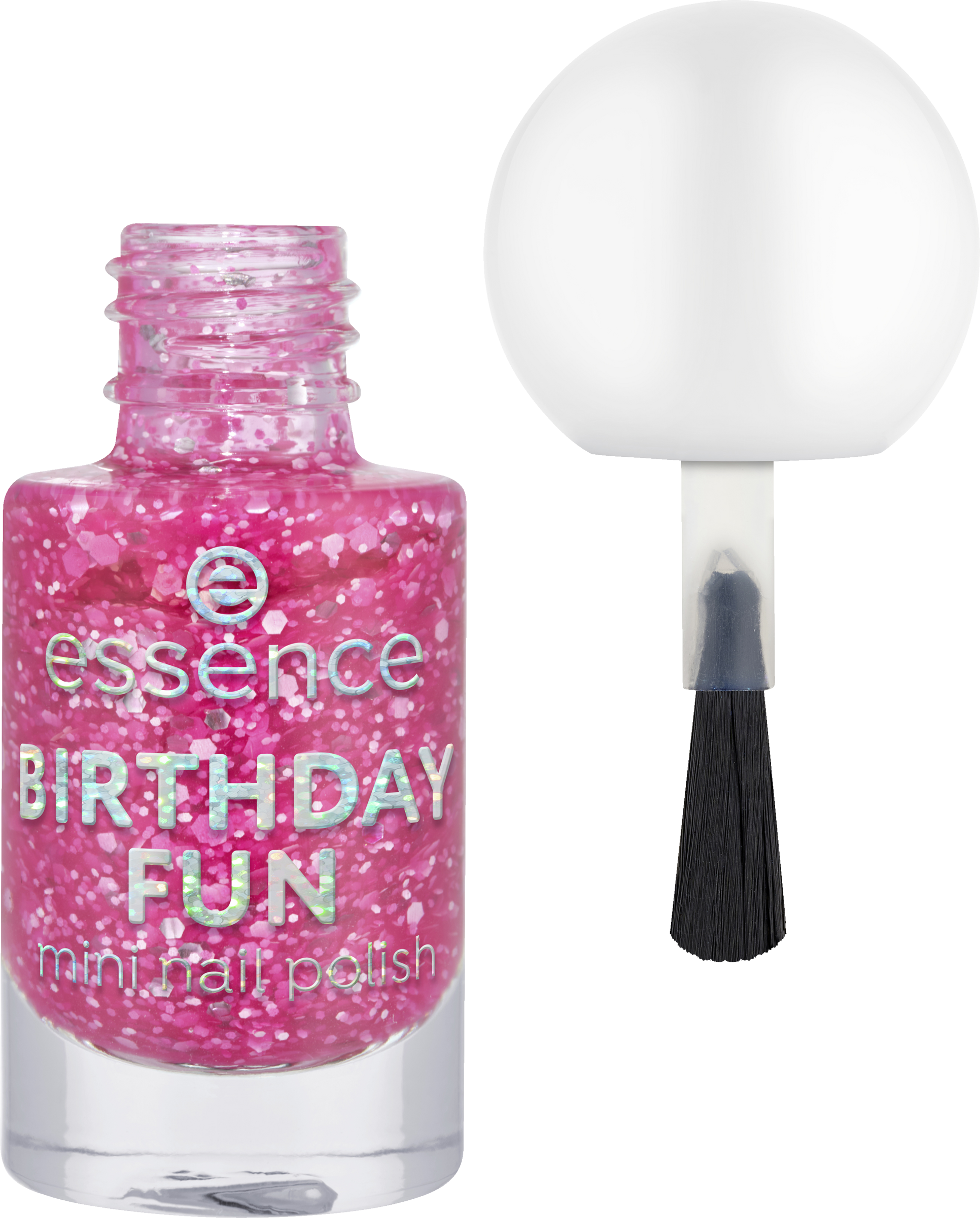Großer Spaß in einer kleinen Flasche – der essence BIRTHDAY FUN mini-Nagellack 05. Die verspielte Verpackung mit dem runden Verschluss enthält einen Nagellack mit leichtem Glitzereffekt in rosafarbenen Nuancen. Ob du deinen besonderen Tag feierst oder eine Freundin überraschen möchtest – mit dem handlichen Nagellack wird jeder Tag zu einer kleinen Feier. Du kannst ihn entweder eigenständig auftragen oder als Überlack über deine Lieblingsfarbe verwenden, um deinen Fingernägeln ein extra Funkeln zu verleihen.