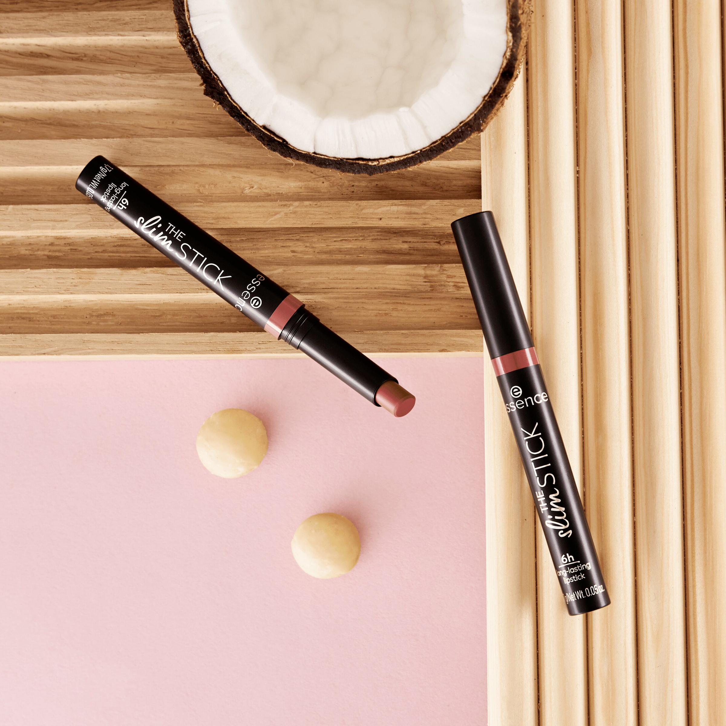 Sag „Hallo“ zum essence THE slim STICK 103 Brickroad in einem zarten Rosa-Farbton! Der langanhaltende Lippenstift überzeugt mit seiner cremigen Textur und seinem samtig-matten Finish. Er ist super angenehm zu tragen – ganz ohne Austrocknen. Der Lippenstift hat eine lange Haltbarkeit von 6 Stunden ohne Verlaufen. Dank des schmalen Packagings ist der Lippenstift einfach und präzise aufzutragen - jederzeit und überall! Zudem pflegt der Lipstick auch gleichzeitig deine Lippen mit der nährenden Formulierung mit Jojobaöl, Macadamiaöl, Kokosnussöl und Vitamin E.