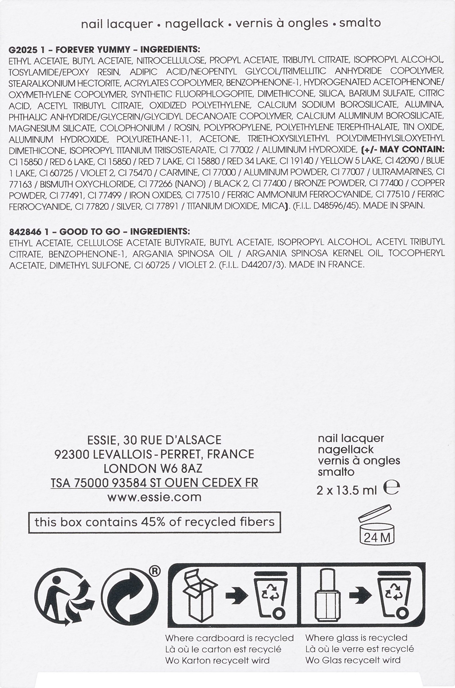 - forever yummy: ETHYL ACETATE • BUTYL ACETATE • NITROCELLULOSE • PROPYL ACETATE • ISOPROPYL ALCOHOL • TRIBUTYL CITRATE • TOSYLAMIDE/EPOXY RESIN • ADIPIC ACID/NEOPENTYL GLYCOL/TRIMELLITIC ANHYDRIDE COPOLYMER • STEARALKONIUM HECTORITE • ACRYLATES COPOLYMER • BENZOPHENONE-1 • HYDROGENATED ACETOPHENONE/OXYMETHYLENE COPOLYMER • DIMETHICONE • ACETYL TRIBUTYL CITRATE • CITRIC ACID • ISOPHORONE DIAMINE/ISOPHTHALIC ACID/TROMETHAMINE COPOLYMER • PHTHALIC ANHYDRIDE/GLYCERIN/GLYCIDYL DECANOATE COPOLYMER • CALCIUM ALUMINUM BOROSILICATE • SILICA • POLYETHYLENE TEREPHTHALATE • OXIDIZED POLYETHYLENE • CALCIUM SODIUM BOROSILICATE • ETHYL TOSYLAMIDE • SYNTHETIC FLUORPHLOGOPITE • ALUMINA • COLOPHONIUM / ROSIN • MAGNESIUM SILICATE • TIN OXIDE • POLYACRYLATE-4 • POLYURETHANE-11 • CI 77002 / ALUMINUM HYDROXIDE • ALUMINUM HYDROXIDE ● [+/- MAY CONTAIN: CI 77891 / TITANIUM DIOXIDE • CI 19140 / YELLOW 5 LAKE • CI 77491, CI 77499 / IRON OXIDES • MICA • CI 15850 / RED 6 LAKE • CI 77120 / BARIUM SULFATE • CI 15850 / RED 7 LAKE • CI 15880 / RED 34 LAKE • CI 77163 / BISMUTH OXYCHLORIDE • CI 77510 / FERRIC AMMONIUM FERROCYANIDE • CI 77266 [NANO] / BLACK 2 • CI 77400 / BRONZE POWDER • CI 77510 / FERRIC FERROCYANIDE • CI 42090 / BLUE 1 LAKE • CI 77288 / CHROMIUM OXIDE GREENS • CI 45410 / RED 28 • CI 60725 / VIOLET 2 • CI 77400 / COPPER POWDER • CI 15850 / RED 7 • CI 75470 / CARMINE • CI 45370 / ORANGE 5 • CI 45380 / RED 21 • CI 77000 / ALUMINUM POWDER]. (F.I.L. D48596/13).