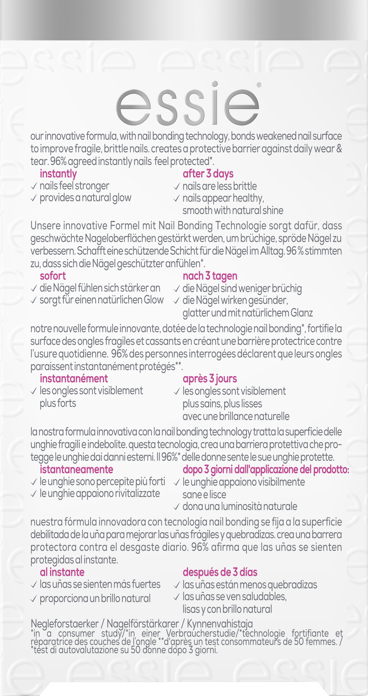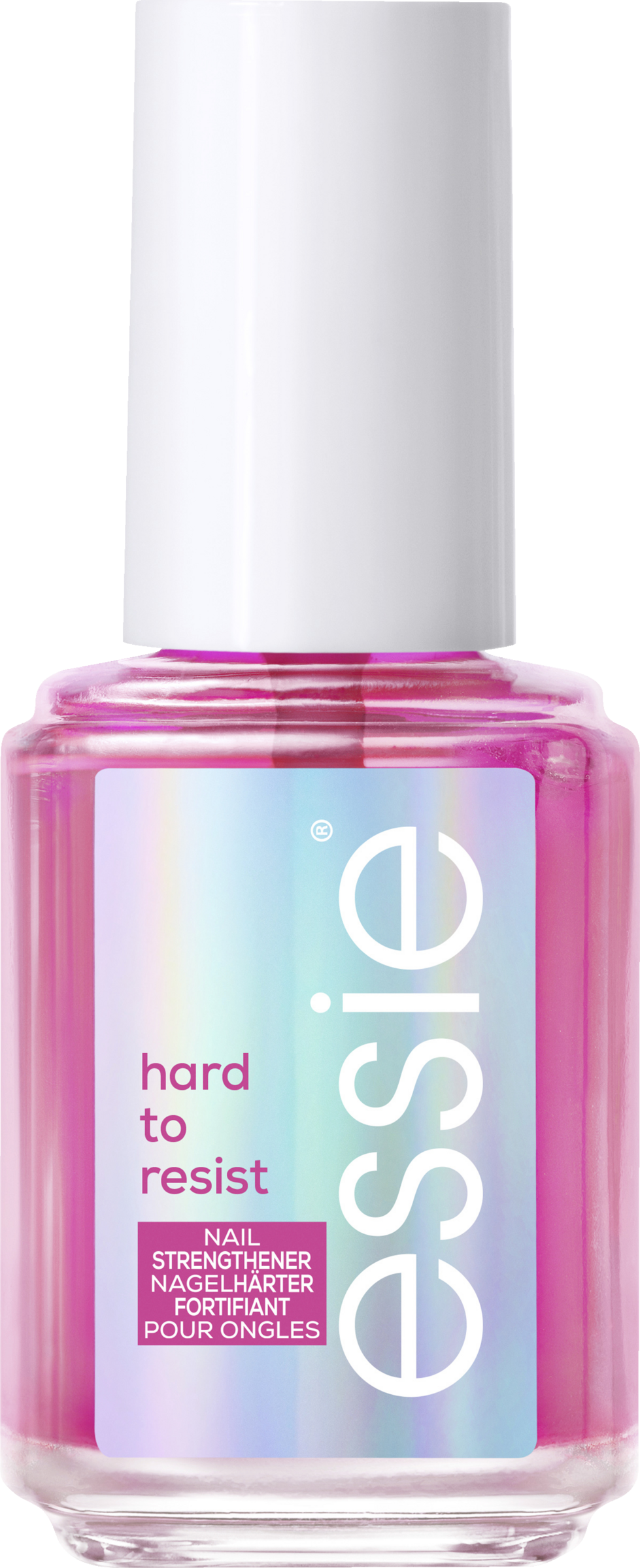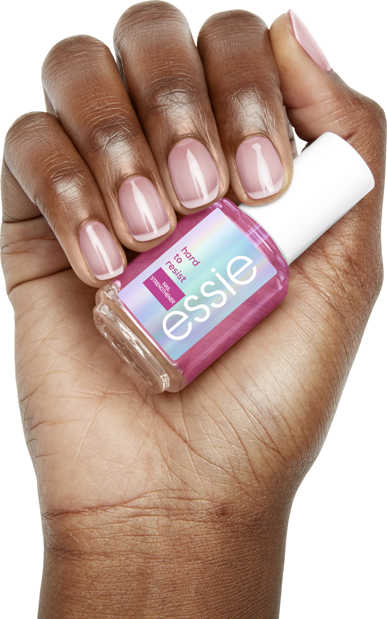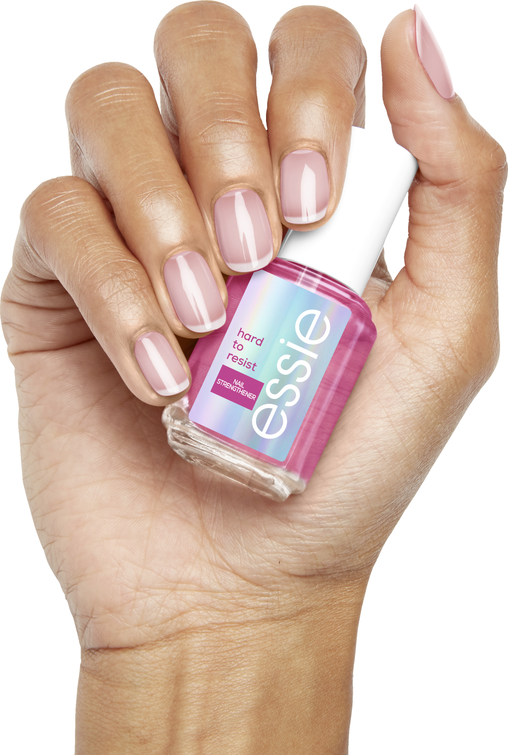 Weniger brüchige Nägel nach drei Tagen. Der essie hard to resist Nagelhärter sorgt für stärkere Nägel, die sich bereits nach drei Tagen weniger brüchig anfühlen. Die innovative nail bonding Technologie bindet die geschwächte, angegriffene Nageloberfläche, sodass sich die Nägel sofort geschützt anfühlen. Der hard to resist bildet eine schützende Oberfläche wodurch die Nägel weniger von täglicher Abnutzung angegriffen werden. Der pinke Unterton sorgt für einen natürlichen und gesunden Glanz, wobei die vegane Formel ohne Inhaltsstoffe tierischen Ursprungs auf Formaldehyde verzichtet.