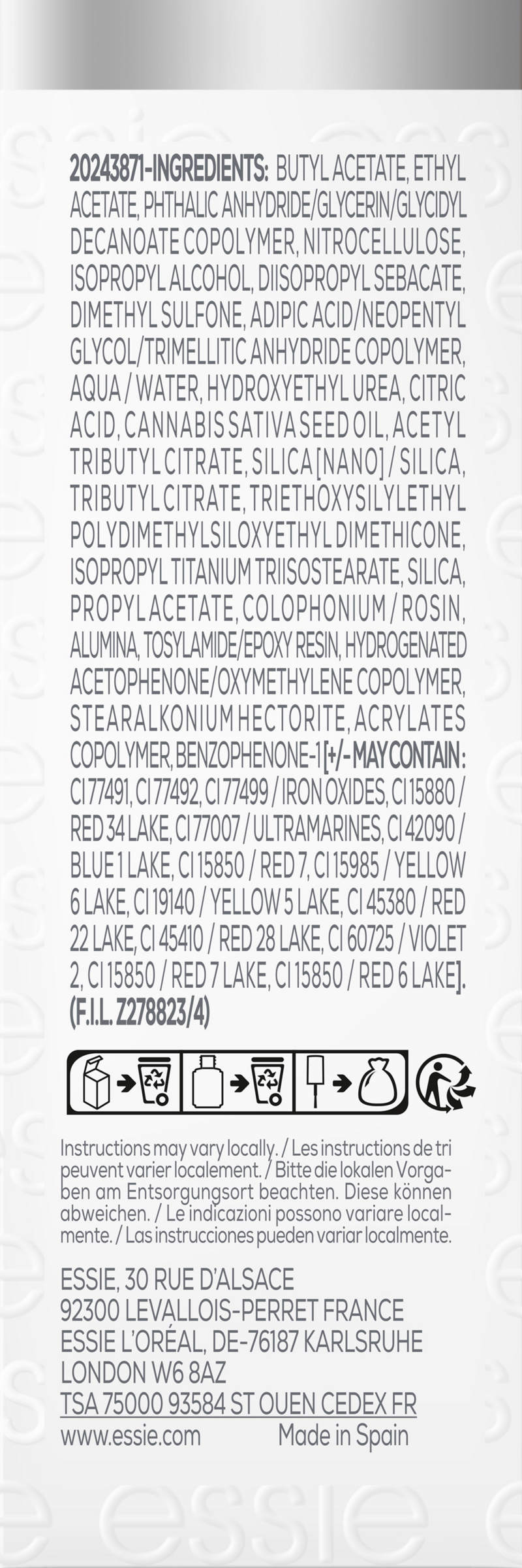 BUTYL ACETATE • ETHYL ACETATE • PHTHALIC ANHYDRIDE/GLYCERIN/GLYCIDYL DECANOATE COPOLYMER • NITROCELLULOSE • ISOPROPYL ALCOHOL • DIISOPROPYL SEBACATE • DIMETHYL SULFONE • ADIPIC ACID/NEOPENTYL GLYCOL/TRIMELLITIC ANHYDRIDE COPOLYMER • AQUA / WATER • HYDROXYETHYL UREA • CITRIC ACID • CANNABIS SATIVA SEED OIL • ACETYL TRIBUTYL CITRATE • SILICA [NANO] / SILICA • TRIBUTYL CITRATE • TRIETHOXYSILYLETHYL POLYDIMETHYLSILOXYETHYL DIMETHICONE • ISOPROPYL TITANIUM TRIISOSTEARATE • SILICA • PROPYL ACETATE • COLOPHONIUM / ROSIN • ALUMINA • TOSYLAMIDE/EPOXY RESIN • HYDROGENATED ACETOPHENONE/OXYMETHYLENE COPOLYMER • STEARALKONIUM HECTORITE • ACRYLATES COPOLYMER • BENZOPHENONE-1 ● [+/- MAY CONTAIN: CI 77491, CI 77492, CI 77499 / IRON OXIDES • CI 15880 / RED 34 LAKE • CI 77007 / ULTRAMARINES • CI 42090 / BLUE 1 LAKE • CI 15850 / RED 7 • CI 15985 / YELLOW 6 LAKE • CI 19140 / YELLOW 5 LAKE • CI 45380 / RED 22 LAKE • CI 45410 / RED 28 LAKE • CI 60725 / VIOLET 2 • CI 15850 / RED 7 LAKE • CI 15850 / RED 6 LAKE]. (F.I.L. Z278823/4).