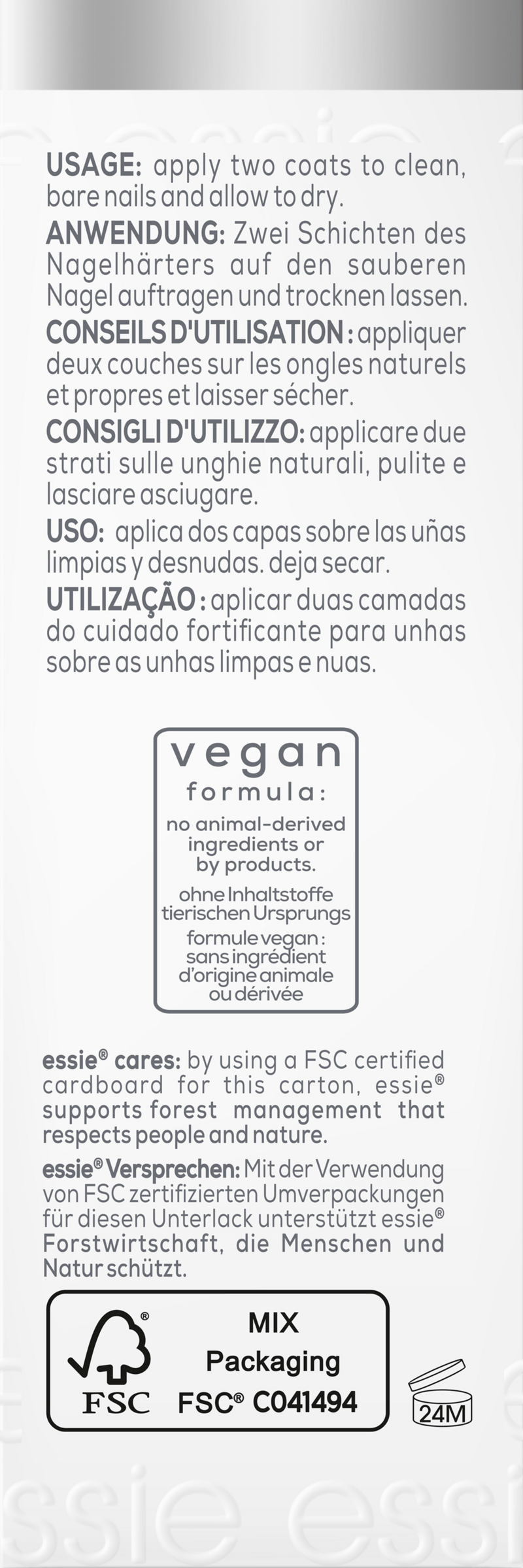 Vor der Anwendung des essie hard to resist Nagelhärters sollte der Nagel gereinigt werden und von sämtlichen Rückständen befreit werden. Dann zwei Schichten des essie hard to resist Nagelhärters auf den trockenen natürlichen Nagel auftragen und gut trocknen lassen. Für optimale Ergebnisse sollte der hard to resist Nagelhärter drei Tage durchgehend getragen werden bevor er entfernt wird.