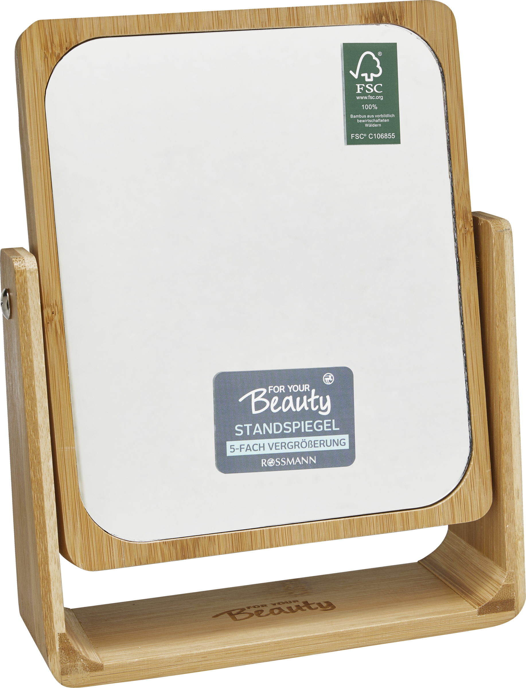 Der for your Beauty Standspiegel aus FSC®-zertifiziertem Bambusholz überzeugt durch seine Ausführung im großen, eckigen Design und lässt sich je nach Blickwinkel flexibel einstellen. Immer dann, wenn Sie eine 5-fache Vergrößerung der Ansicht brauchen, ist der for your Beauty Standspiegel zur Stelle.