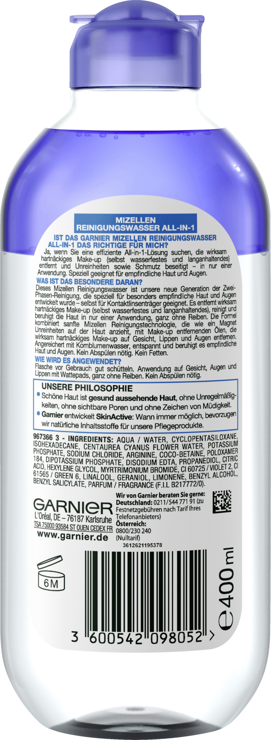 AQUA / WATER, CYCLOPENTASILOXANE,ISOHEXADECANE, CENTAUREA CYANUS FLOWER WATER, POTASSIUM PHOSPHATE,SODIUM CHLORIDE, ARGININE, COCO-BETAINE, POLOXAMER 184, DIPOTASSIUM PHOSPHATE, DISODIUM EDTA, PROPANEDIOL,CITRIC ACID, HEXYLENE GLYCOL,MYRTRIMONIUM BROMIDE, CI 60725 / VIOLET 2, CI 61565 / GREEN 6, LINALOOL,GERANIOL, LIMONENE, BENZYL ALCOHOL,BENZYL SALICYLATE, PARFUM / FRAGRANCE(F.I.L B217772/0)