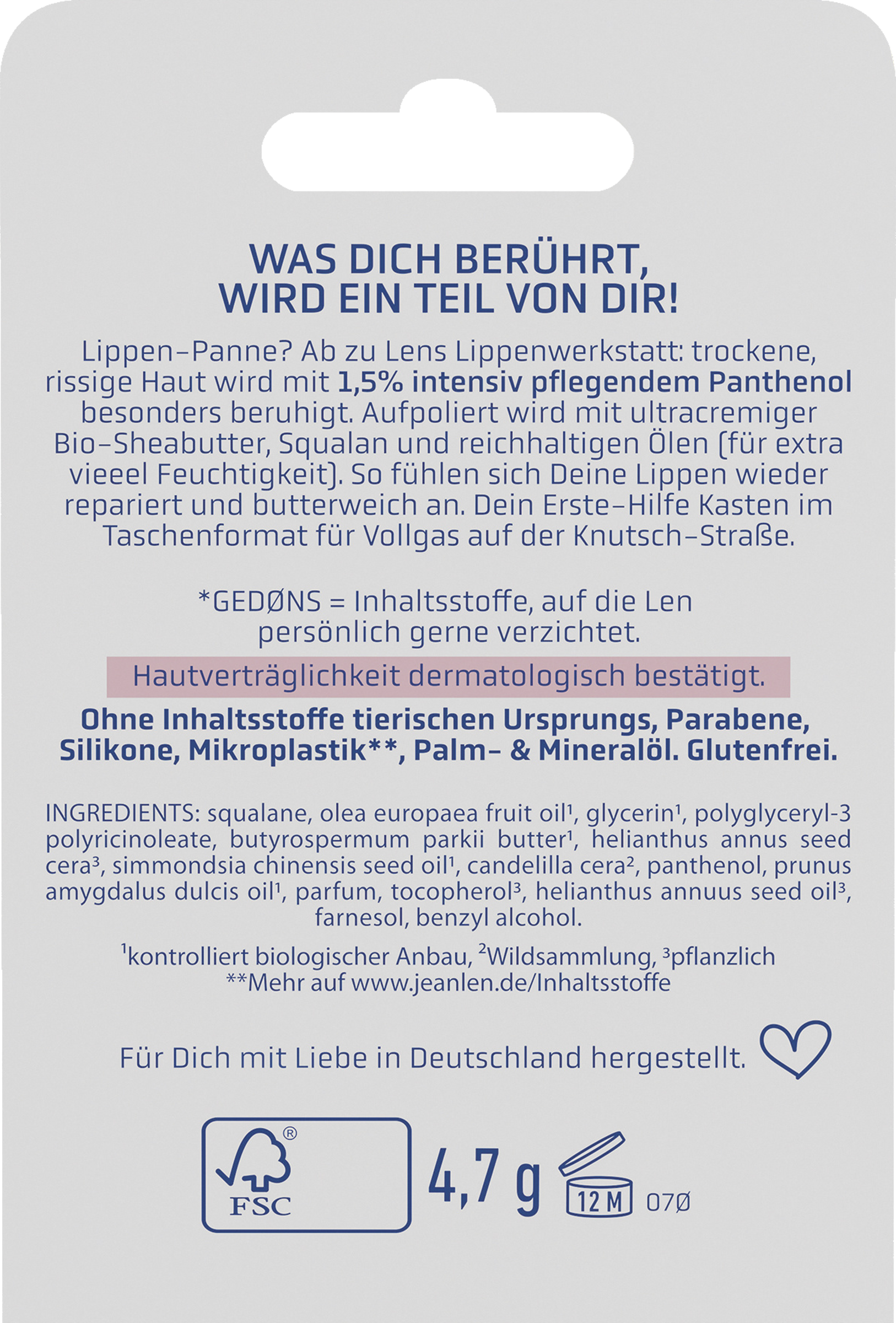 Lippen-Panne? Ab zu Lens Lippenwerkstatt: trockene, rissige Haut wird mit 1,5% intensiv pflegendem Panthenol besonders beruhigt. Aufpoliert wird mit ultracremiger Bio-Sheabutter, Squalan und reichhaltigen Ölen (für extra vieeel Feuchtigkeit). So fühlen sich Deine Lippen wieder repariert und butterweich an. Dein Erste-Hilfe Kasten im Taschenformat für Vollgas auf der Knutsch-Straße.