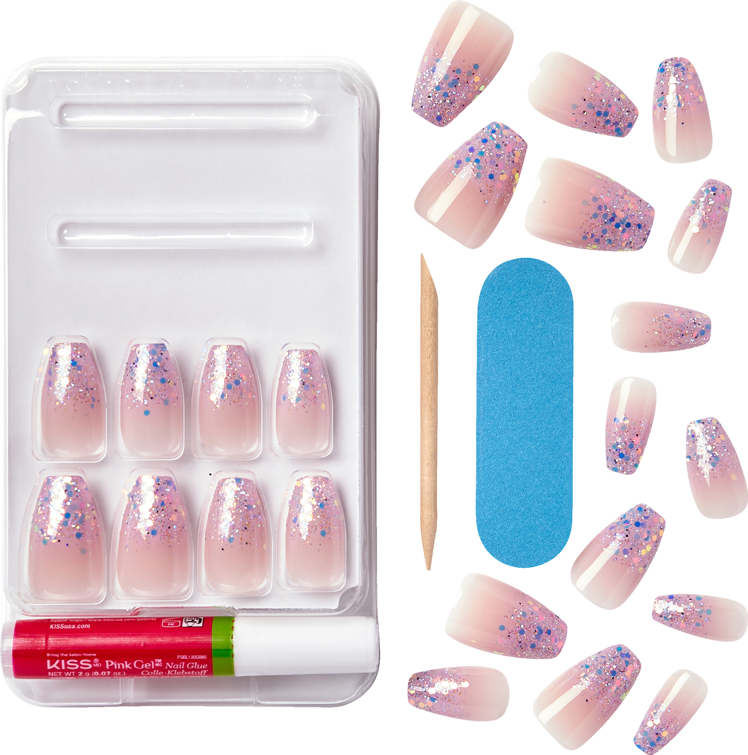 - 24 Kunstfingernäge, 1 Nagelkleber pink 2g, 1 Mini-Feile, 1 Manikürstäbchen