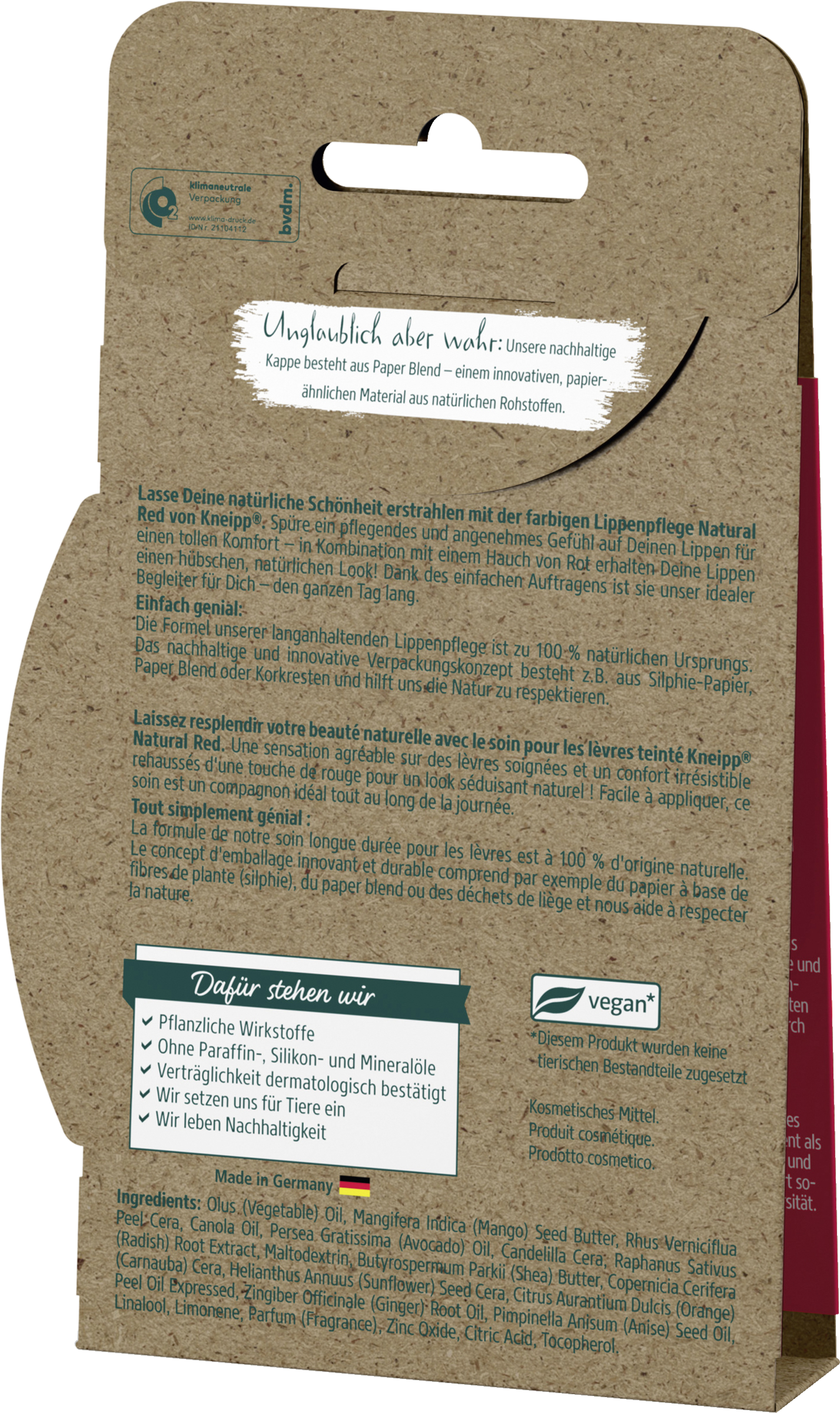 Lasse Deine natürliche Schönheit erstrahlen mit der farbigen Lippenpflege Natural Red von Kneipp®. Spüre ein pflegendes und angenehmes Gefühl auf Deinen Lippen für einen tollen Komfort – in Kombination mit einem Hauch von Rot erhalten Deine Lippen einen hübschen, natürlichen Look! Dank des einfachen Auftragens ist sie unser idealer Begleiter für Dich – den ganzen Tag lang. Einfach genial: Die Formel unserer langanhaltenden Lippenpflege ist zu 100% natürlichen Ursprungs. Das nachhaltige und innovative Verpackungskonzept besteht z.B. aus Graspapier, Paper Blend oder Korkresten und hilft uns die Natur zu respektieren.