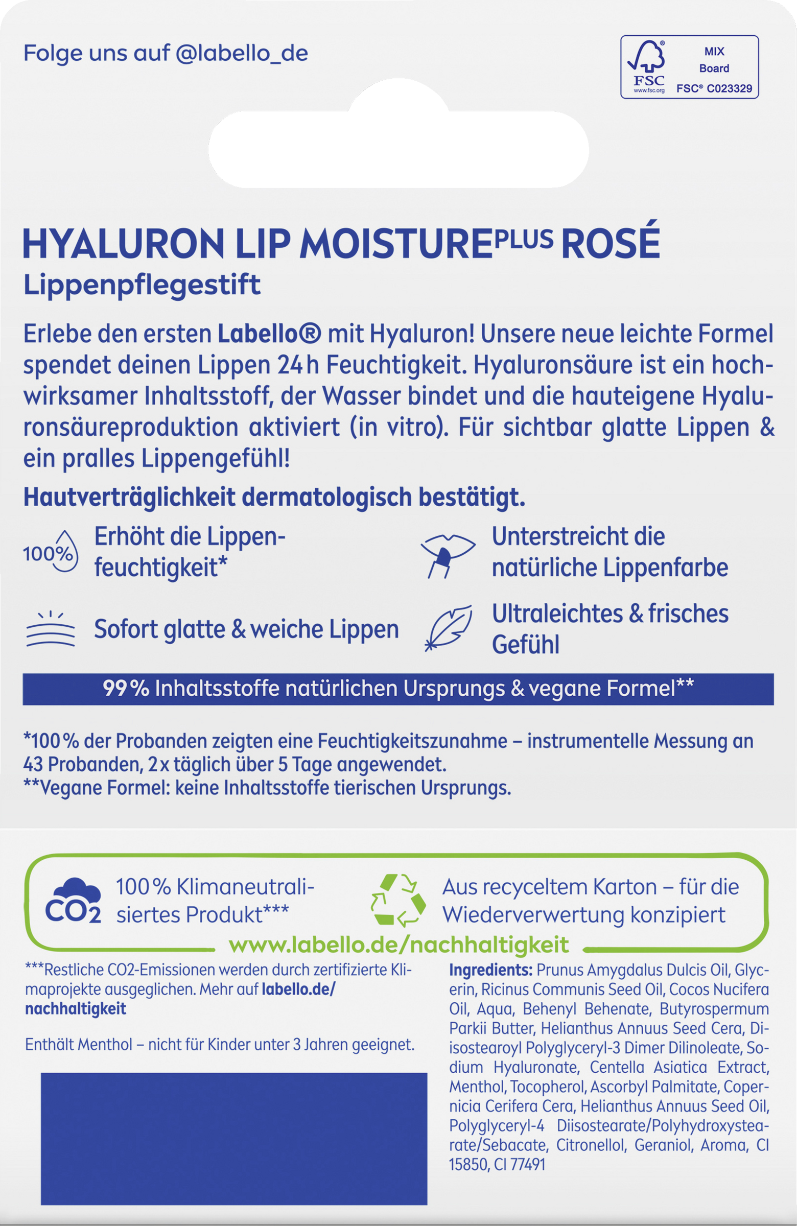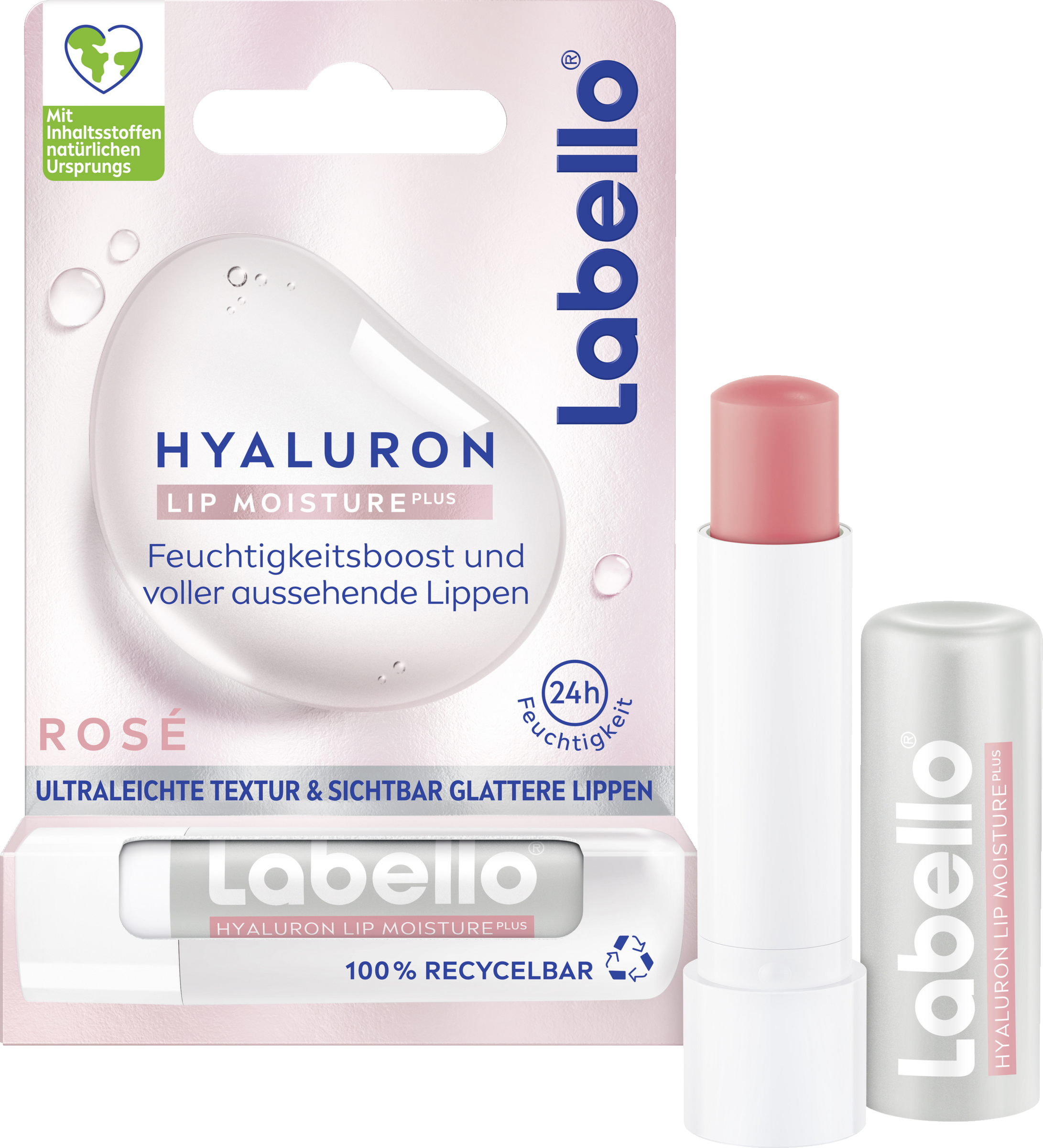 Die neue ultraleichte Formel, angereichert mit Hyaluronsäure, versorgt die Lippen von innen heraus mit Feuchtigkeit und hält sie 24h lang intensiv mit Feuchtigkeit versorgt. Das Ergebnis: Sichtbar glattere und spürbar prallere Lippen! Schon gewusst, dass Hyaluronsäure ein hochwirksamer, feuchtigkeitsspendender Inhaltsstoff ist, der Wasser bindet und die hauteigene Hyaluronsäureproduktion anregt? Warte nicht länger und hol dir einen Feuchtigkeitsschub für deine Lippen mit Labello HYALURON LIP MOISTURE PLUS Rosé! Darüber hinaus unterstreicht die Formel die natürliche Lippenfarbe und bietet dank des enthaltenen Menthols ein leichtes, frisches Lippengefühl. Hautverträglichkeit dermatologisch bestätigt.