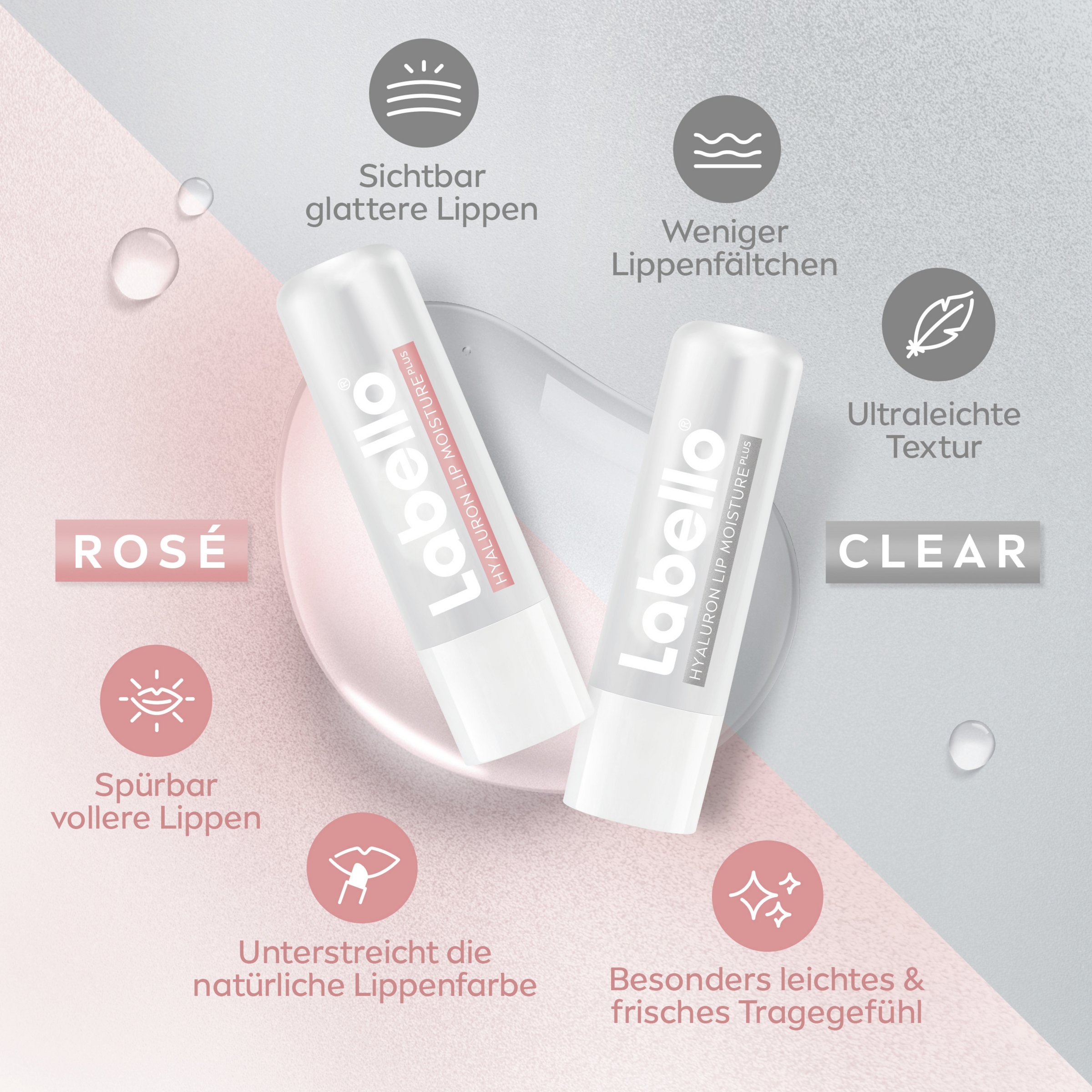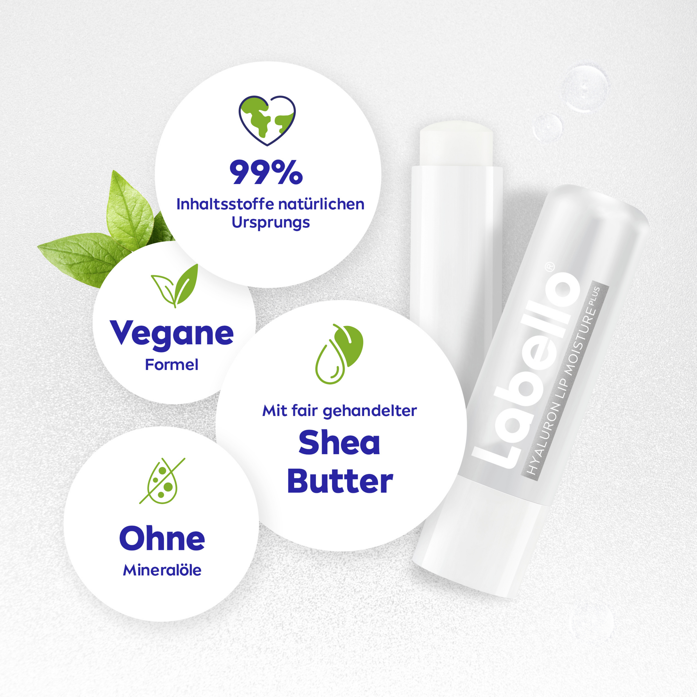 Die neue ultraleichte Formel, angereichert mit Hyaluronsäure, versorgt die Lippen von innen heraus mit Feuchtigkeit und hält sie 24h lang intensiv mit Feuchtigkeit versorgt. Das Ergebnis mit Labello HYALURON LIP MOISTURE sind sichtbar glattere Lippen und weniger Lippenfältchen! Schon gewusst, dass Hyaluronsäure ein hochwirksamer, feuchtigkeitsspendender Inhaltsstoff ist, der Wasser bindet und die hauteigene Hyaluronsäureproduktion anregt? Warte nicht länger und hol dir einen Feuchtigkeitsschub für deine Lippen. Darüber hinaus verleiht die innovative Formel, angereichert mit wertvollem Vitamin E, Mandelöl, Glycerin und Sheabutter, einen natürlichen Glanz ohne zu kleben. Für einen zusätzlichen Glanz können mehrere Schichten aufgetragen werden. Die Hautverträglichkeit ist dermatologisch bestätigt.